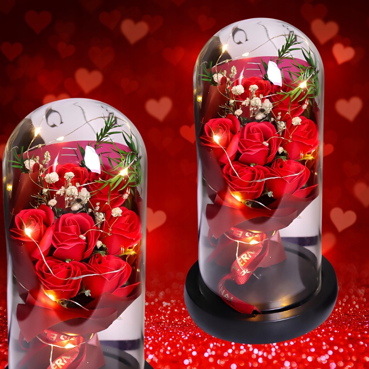 ВІЧНА ТРОЯНДА, ГАРНИЙ БУКЕТ ТРОЯНД У СКЛІ, СВІТЯЩАЯСЯ СВІТОДІОДНОЮ ЛАМПОЮ