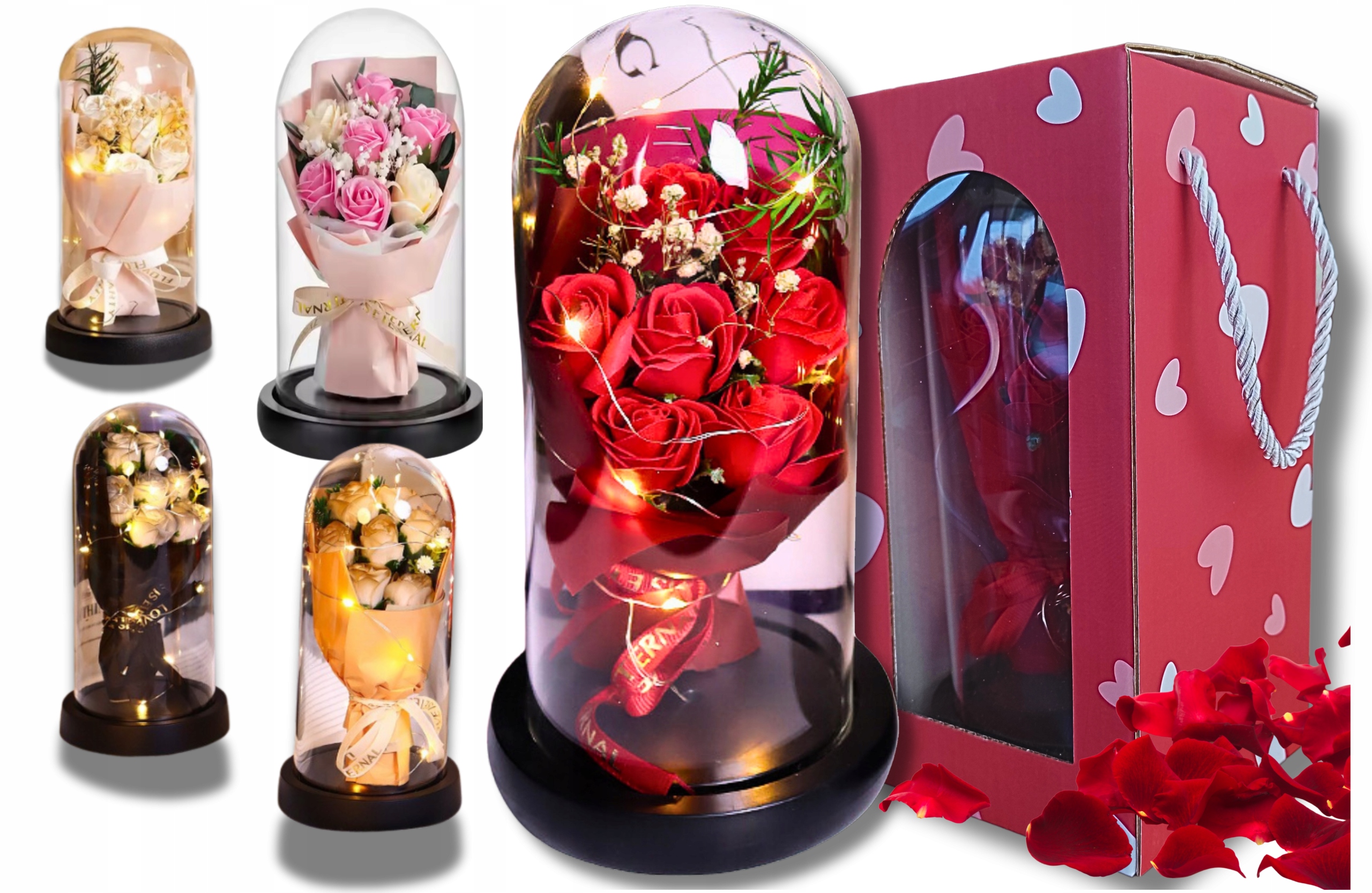 Підберіть її на смак коханої людини! Наш унікальний ВІЧНИЙ БУКЕТ доступний у п’яти стильних кольорах на вибір. Незалежно від того, чи віддаєте ви перевагу класичній червоній елегантності, сучасному рожевому чи нейтральним кольорам чорного чи білого - у нас є щось для вас!