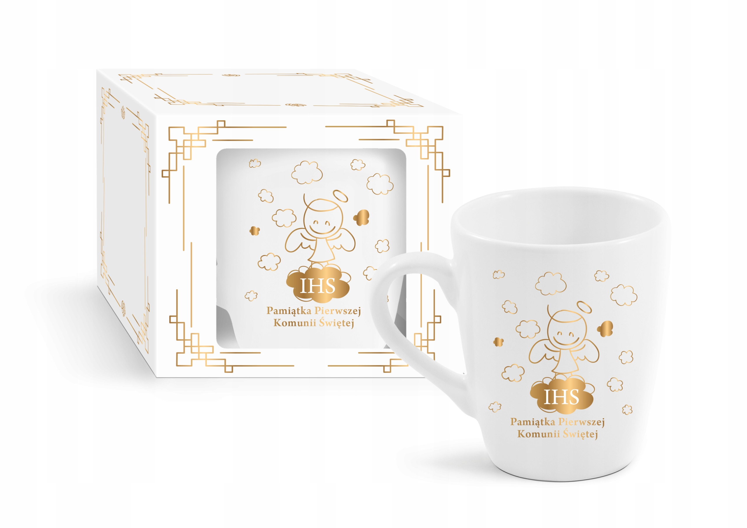Біла керамічна чашка з золотим металевим принтом «IHS Souvenir of the First Holy Communion»