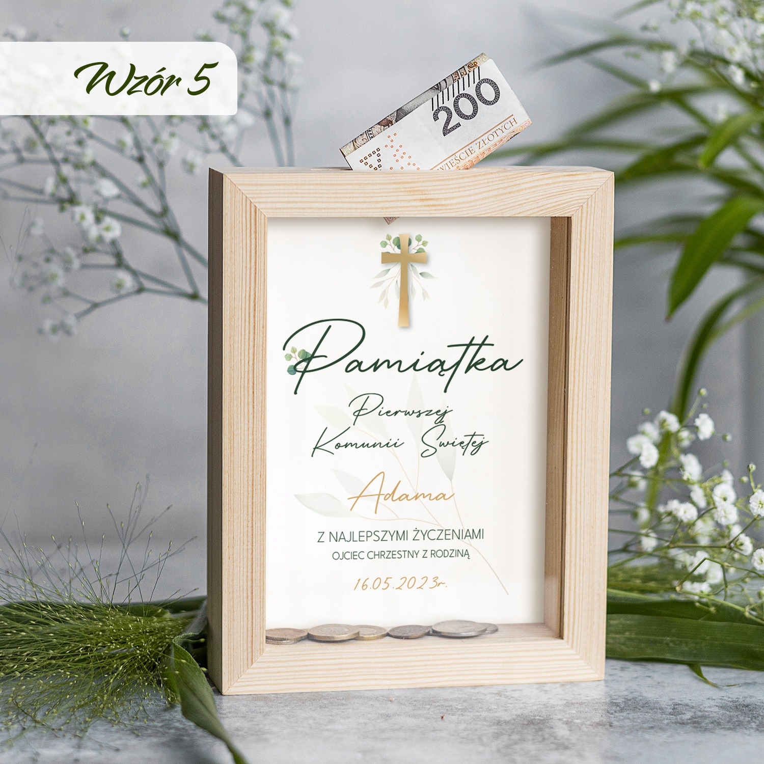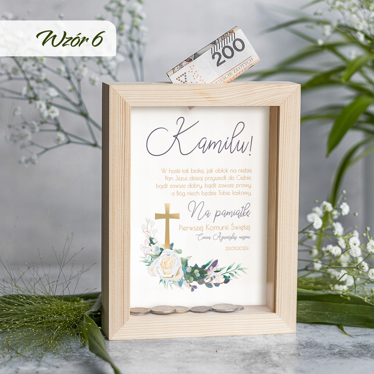 Сувенір до Першого Причастя Святий у вигляді дерев'яної скарбнички стане ідеальним рішенням в якості подарунка від хрещеної матері, кума, тітки чи дядька.