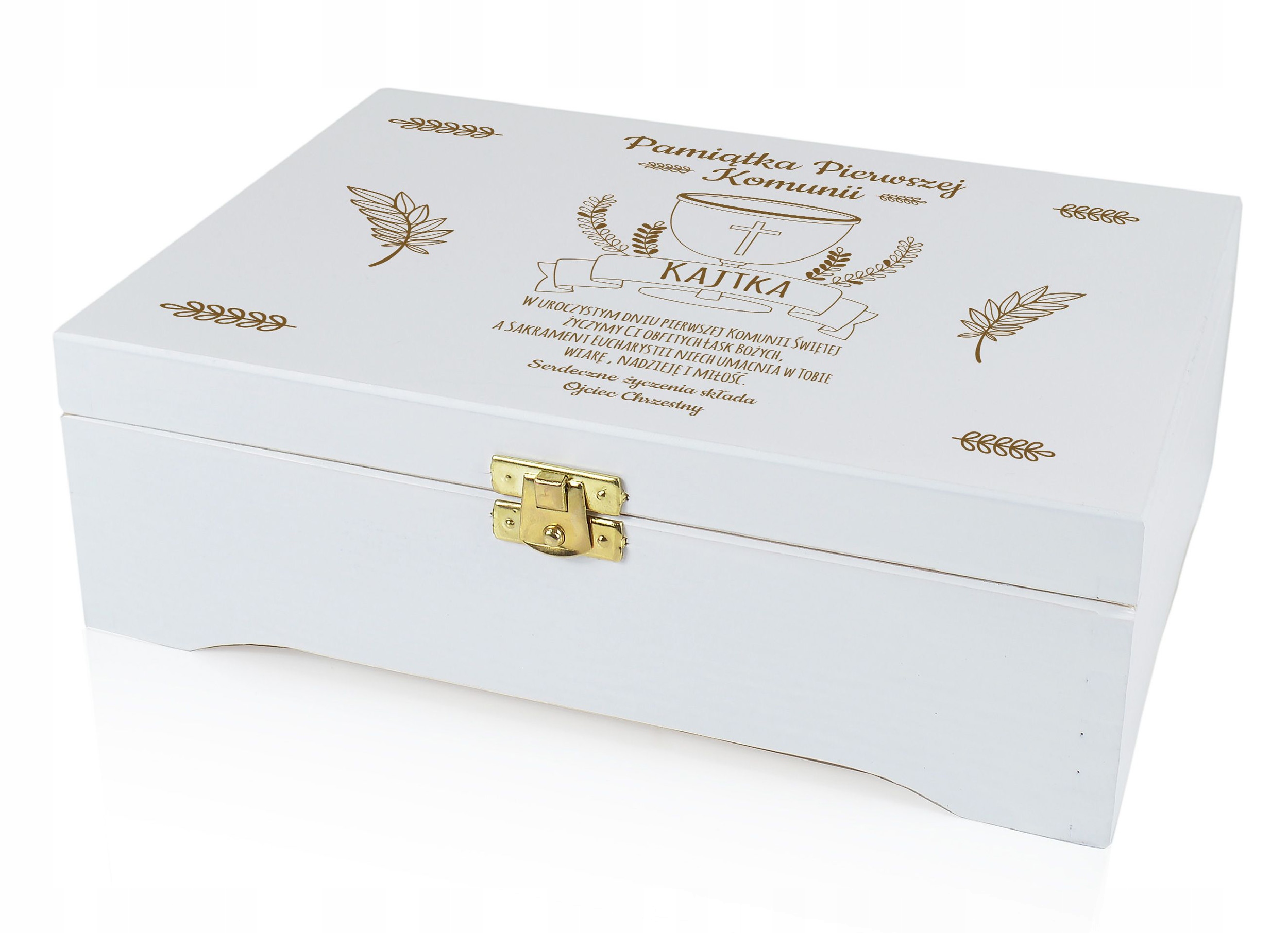 На наступному аукціоні представляємо дерев'яну подарункову коробку для Першого Причастя. Екологічно чисті матеріали та красивий вигравіруваний мотив додають атмосфери та характеру. Всередину ми можемо вільно покласти банкноти та інші дрібні подарунки. Цей оригінальний подарунок викличе посмішку на обличчі кожного одержувача. Наша пропозиція адресована людям, які хочуть здивувати своїх близьких цікавим подарунком.