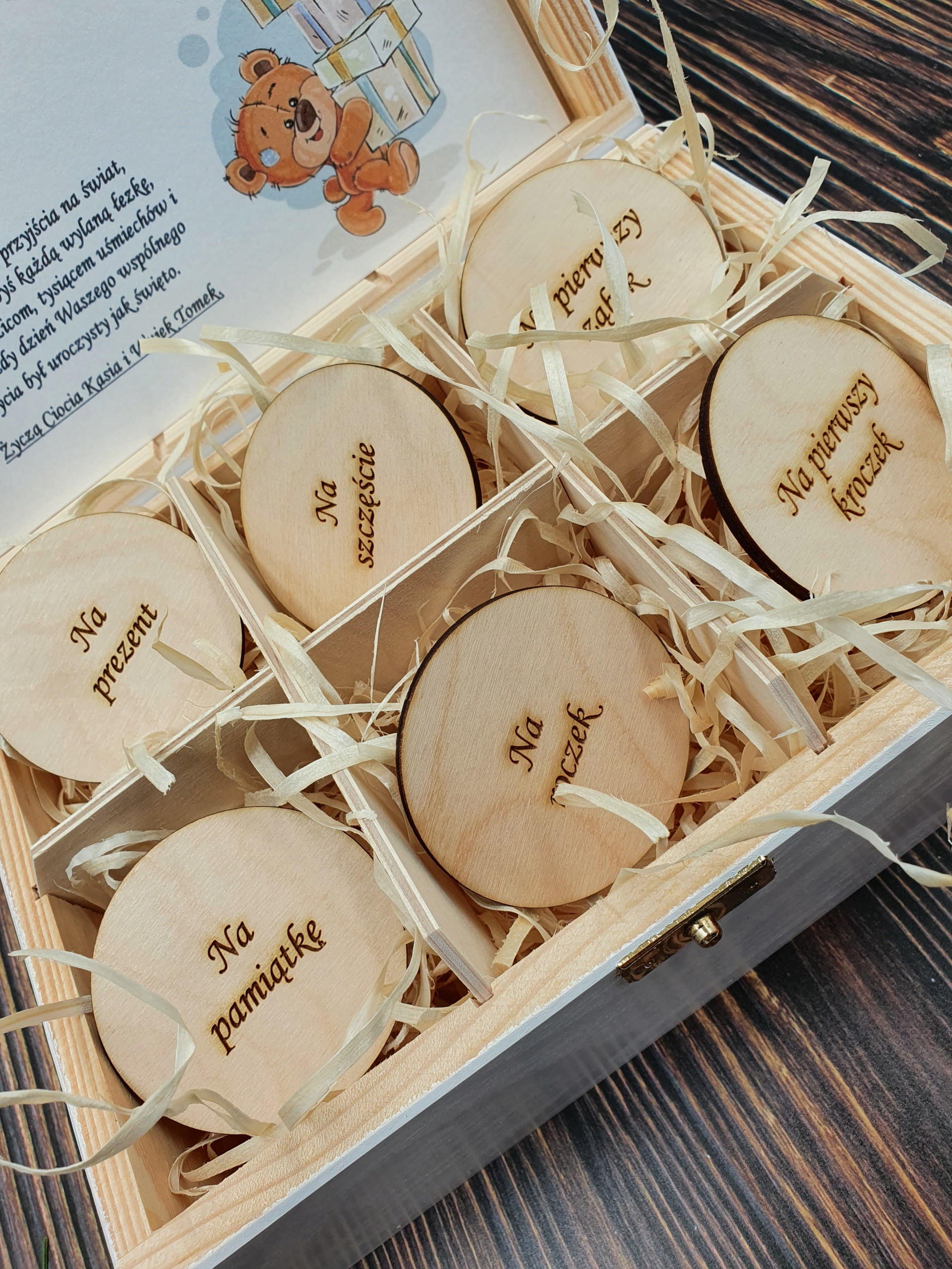 - наповнювач з деревної вовни та 6 етикеток з написами на вибір: