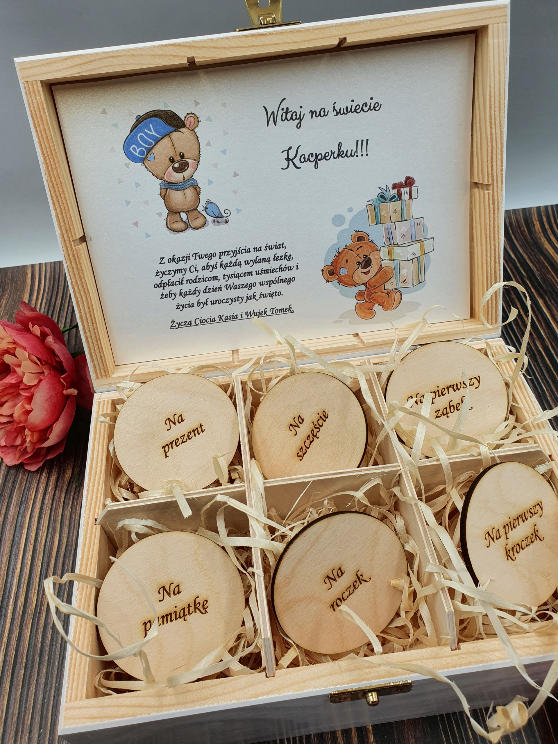 В ньому вказано ім'я дитини та ім'я того, хто дарує подарунок. Також на вибір є побажання на народження дитини. Ви можете надсилати свої побажання.