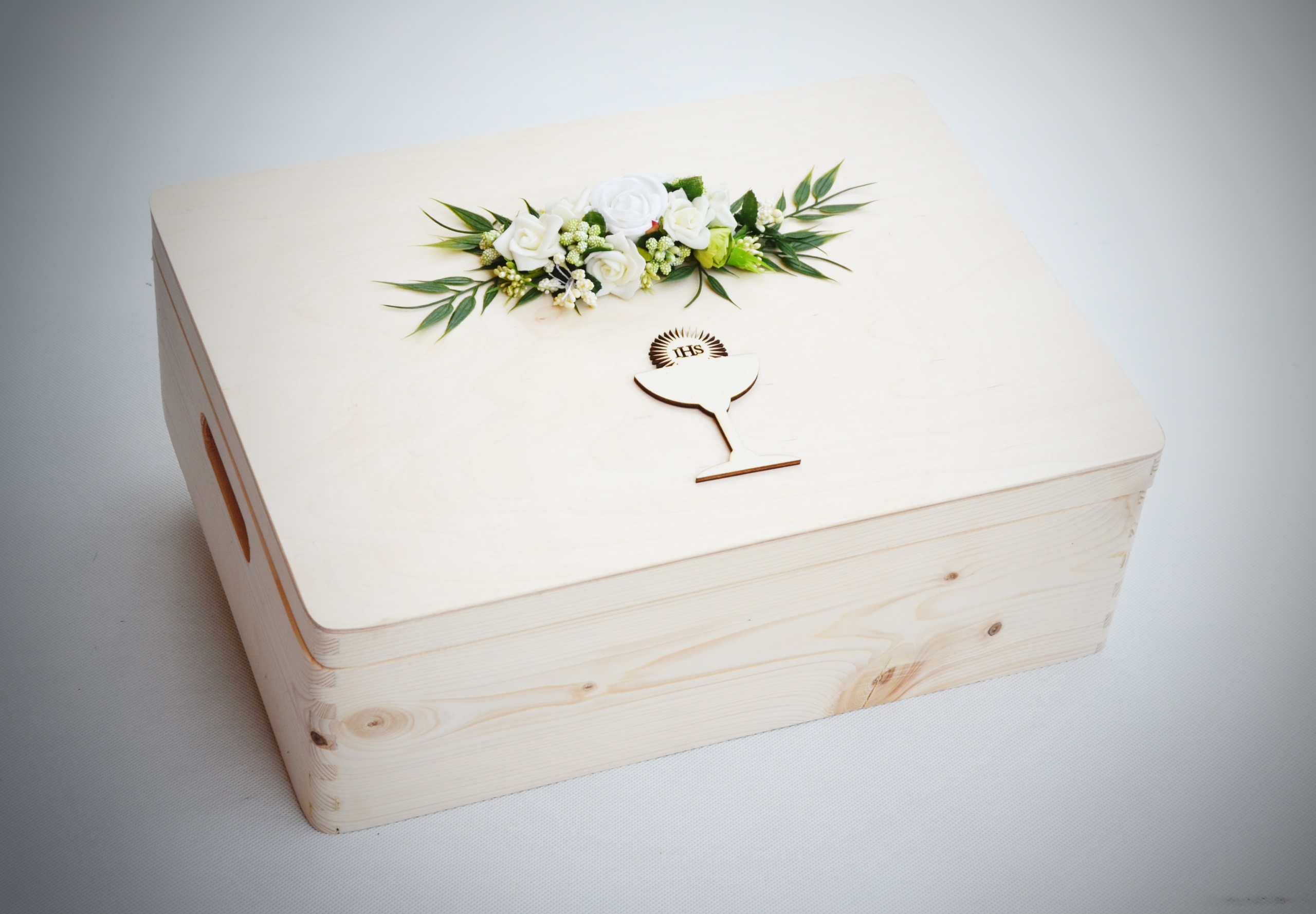 Велика, гарно зроблена, міцна дерев'яна скриня розміром 30x40x14 см. Він служитиме місцем для зберігання сувенірів від Першого Причастя, Біблії, вервиці тощо.