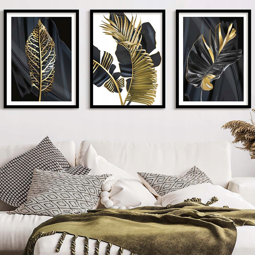 Подарункові картини 3 шт 30х40 см золото чорні сучасні рослини в рамці