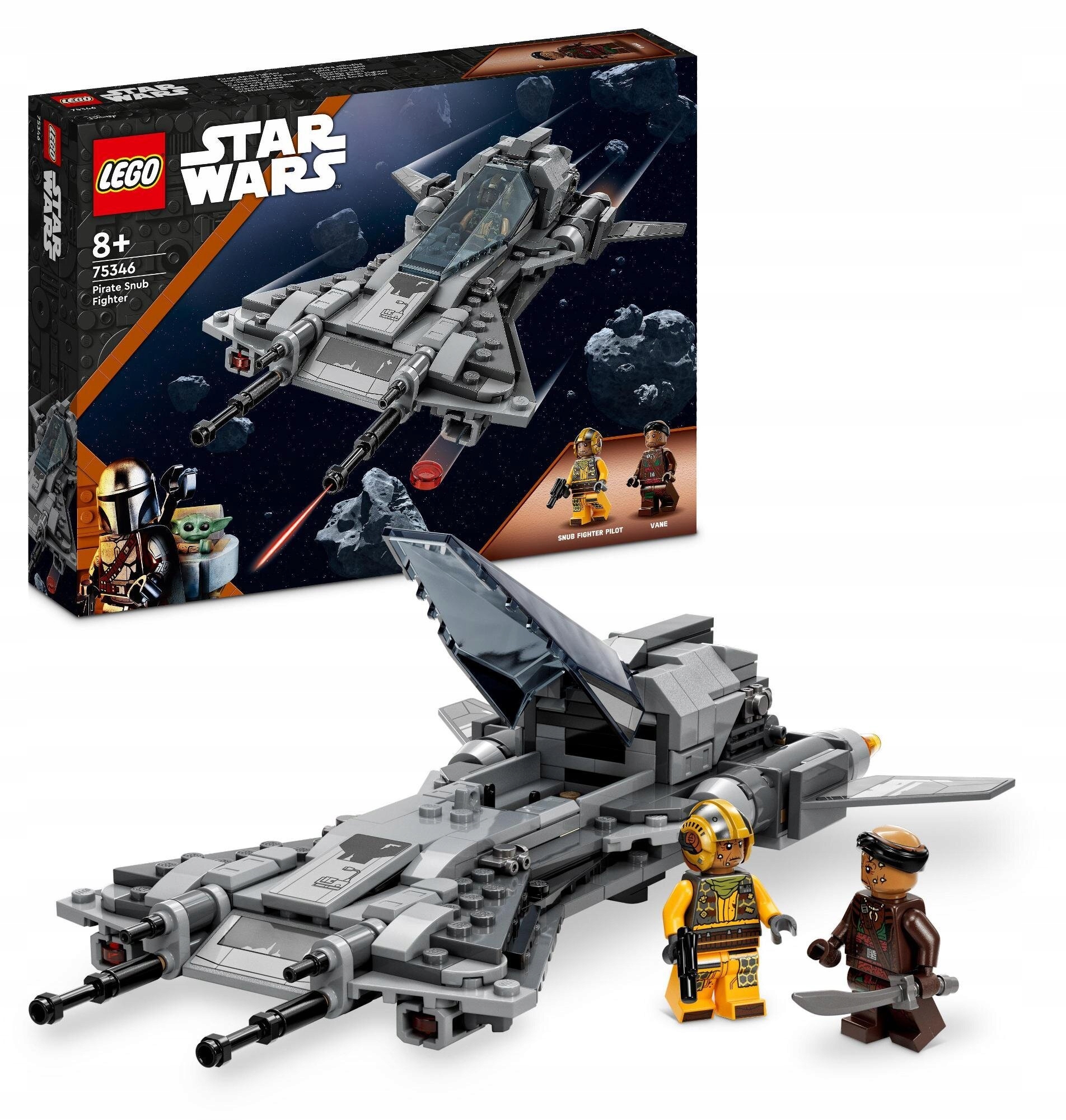 Піратський винищувач має відкриту кабіну з місцем для мініфігури, двох блоків мітла та відсіку для зберігання з тепловим детонатором. Крім того, набір включає два мініфігури LEGO® Star Wars ™ зі зброєю - пілот винищувача має пістолет -бластер та меч лопатей.