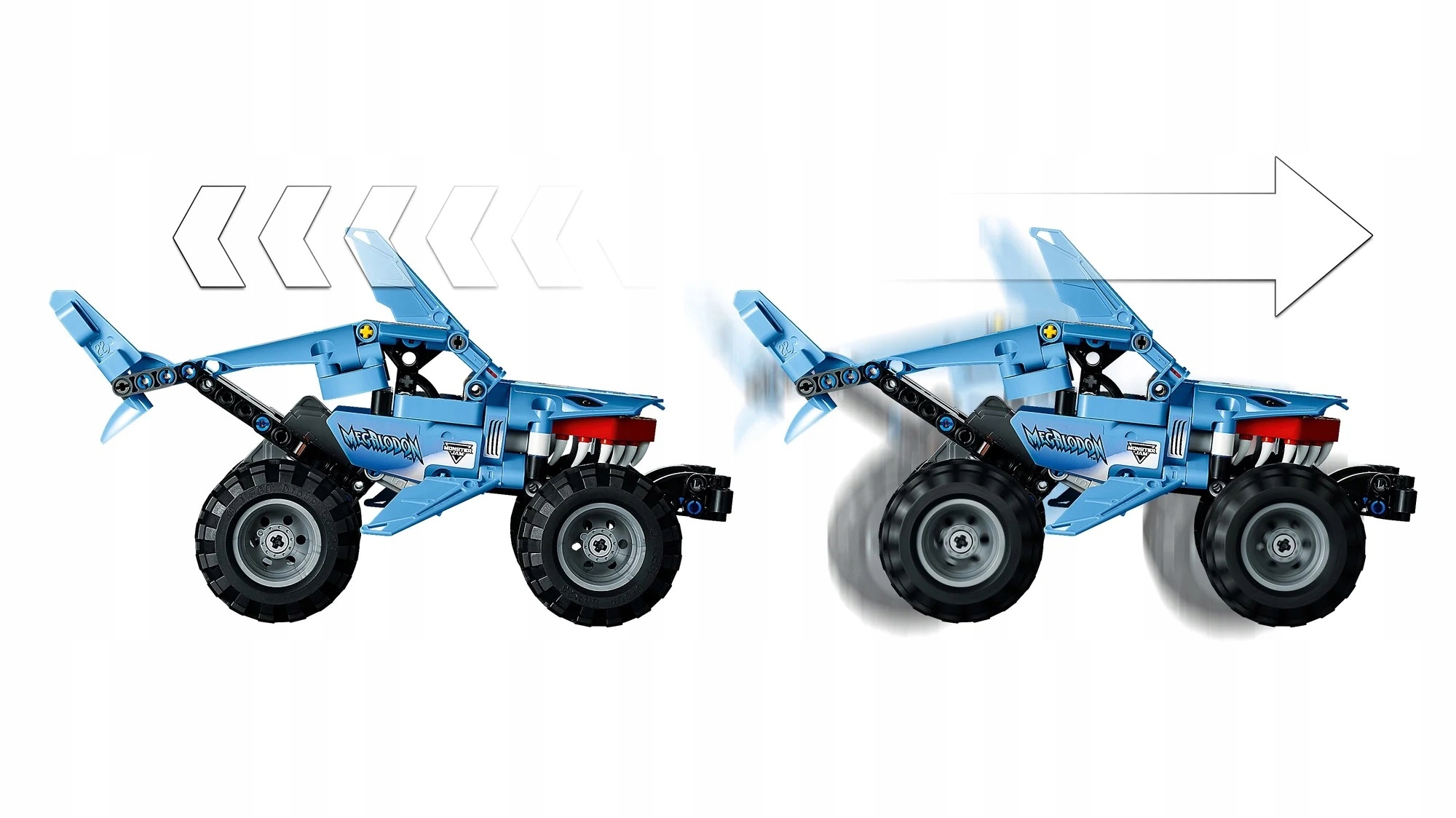Готуйтеся до незабутнього шоу вантажівок-монстрів із набором LEGO® Technic Monster Jam™ Megalodon™. Ця готова до їзди модель створена за мотивами мегалодону — найбільшої акули, яка коли-небудь жила в світі. Здійснюйте вражаючі стрибки та використовуйте відкатний привід, щоб привести машину в рух - як справжня вантажівка-монстр. Закінчивши гру, ви можете переробити автомобіль у низький гонщик, натхненний міфічним монстром на ім’я Луска.