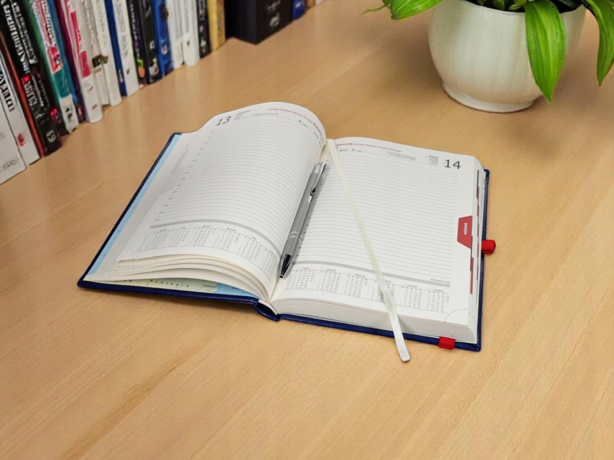 Суцільний календар книг для викладачів для навчального року 2025/2026 в шкіряній обстановці із закриттям на еластичній смузі та кріпленням ручки. Входить з календарем, елегантна металева срібна ручка з синьою вставкою. 4