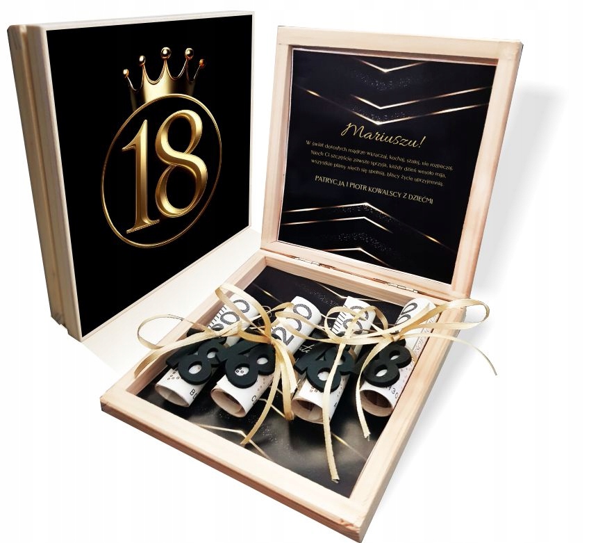 Красива дерев’яна коробка - ідеальна ідея для подарунка з нагоди вісімнадцятого дня народження. Інтер'єр коробки прикрашений наклейкою з посвятою. Крім того, всередині є 4 "18", і золоті стрічки для обов'язкових банкнот.