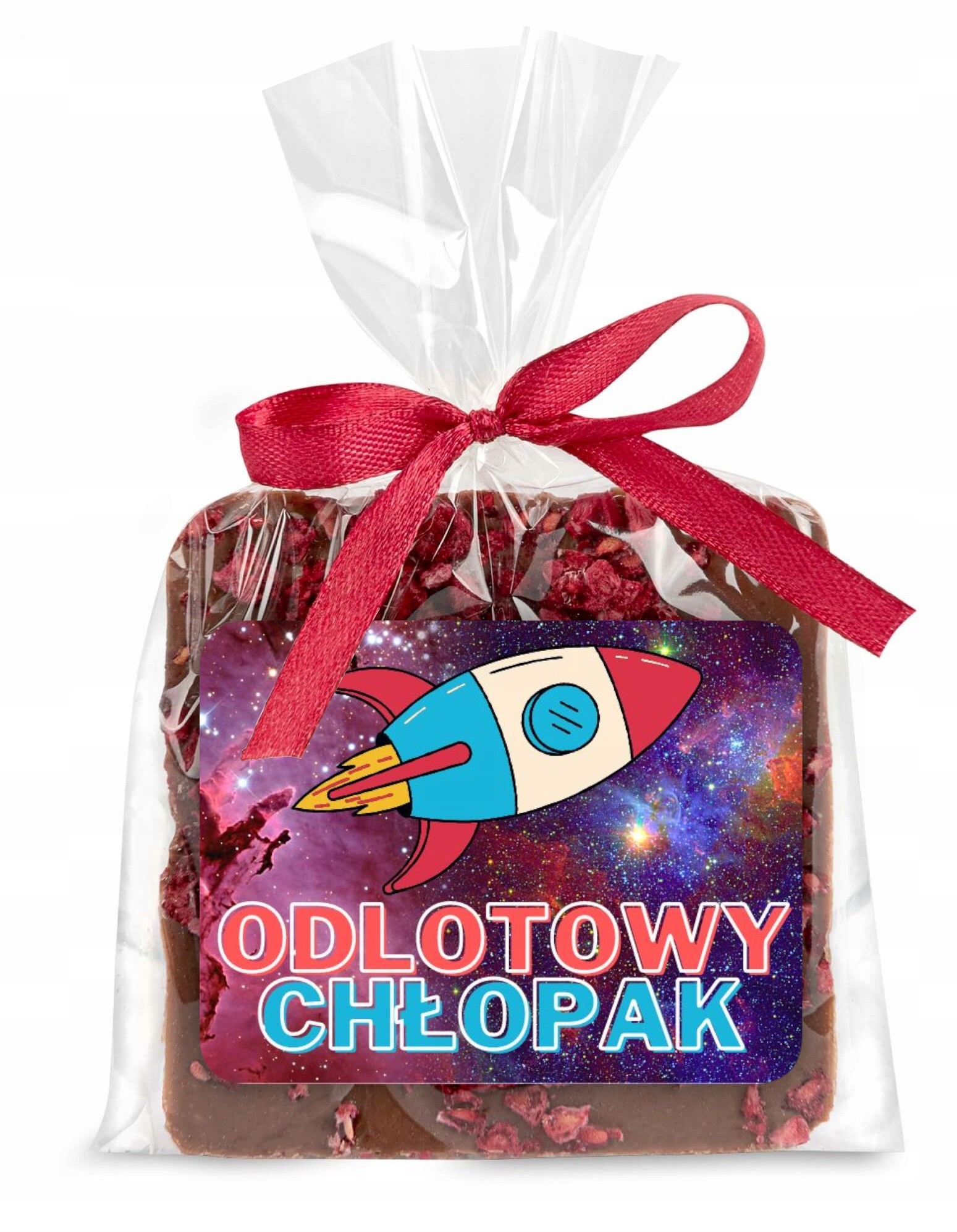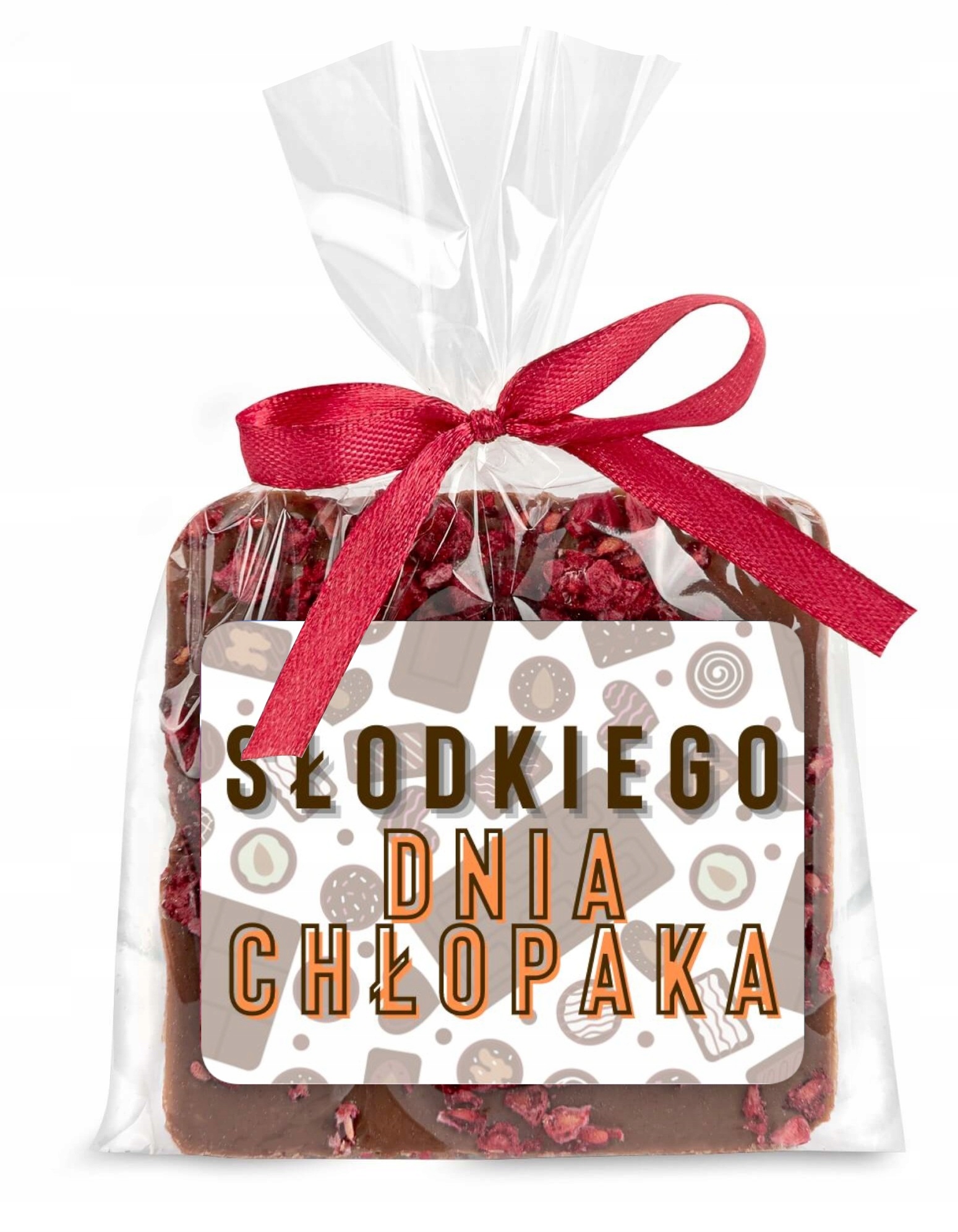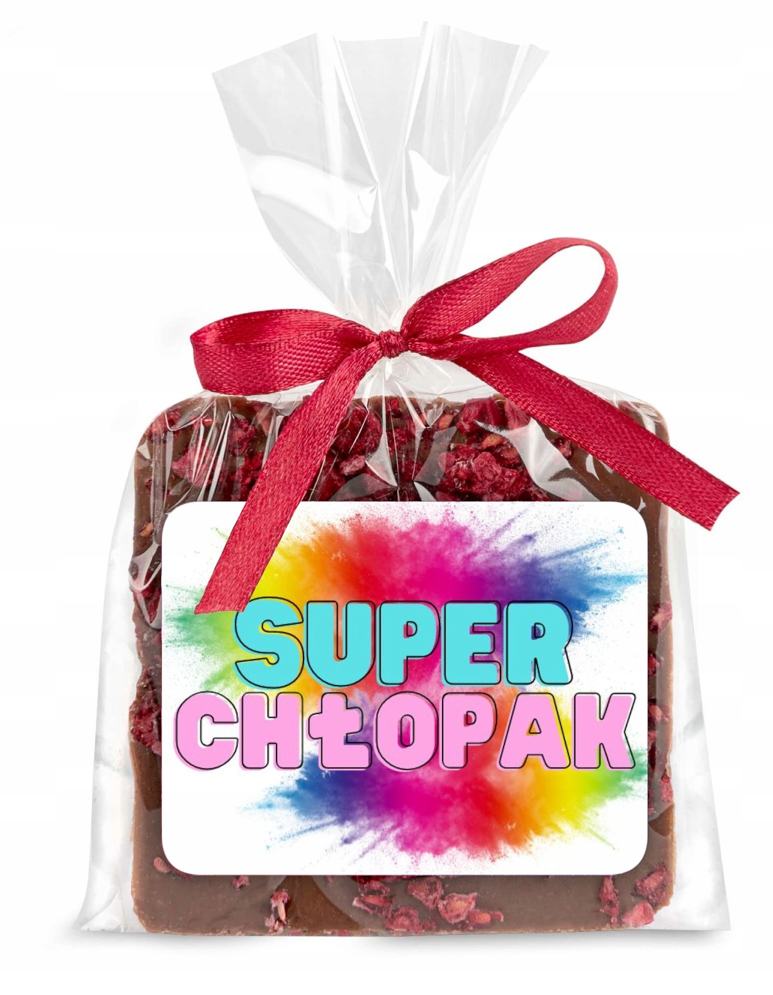 Не тільки красиві, але й смачні молочні шоколадні цукерки у формі квадрата з додаванням ліофілізованих фруктів, декоративно упаковані в целофанову фольгу та перев'язані стрічкою в подарунок до Дня хлопчика.