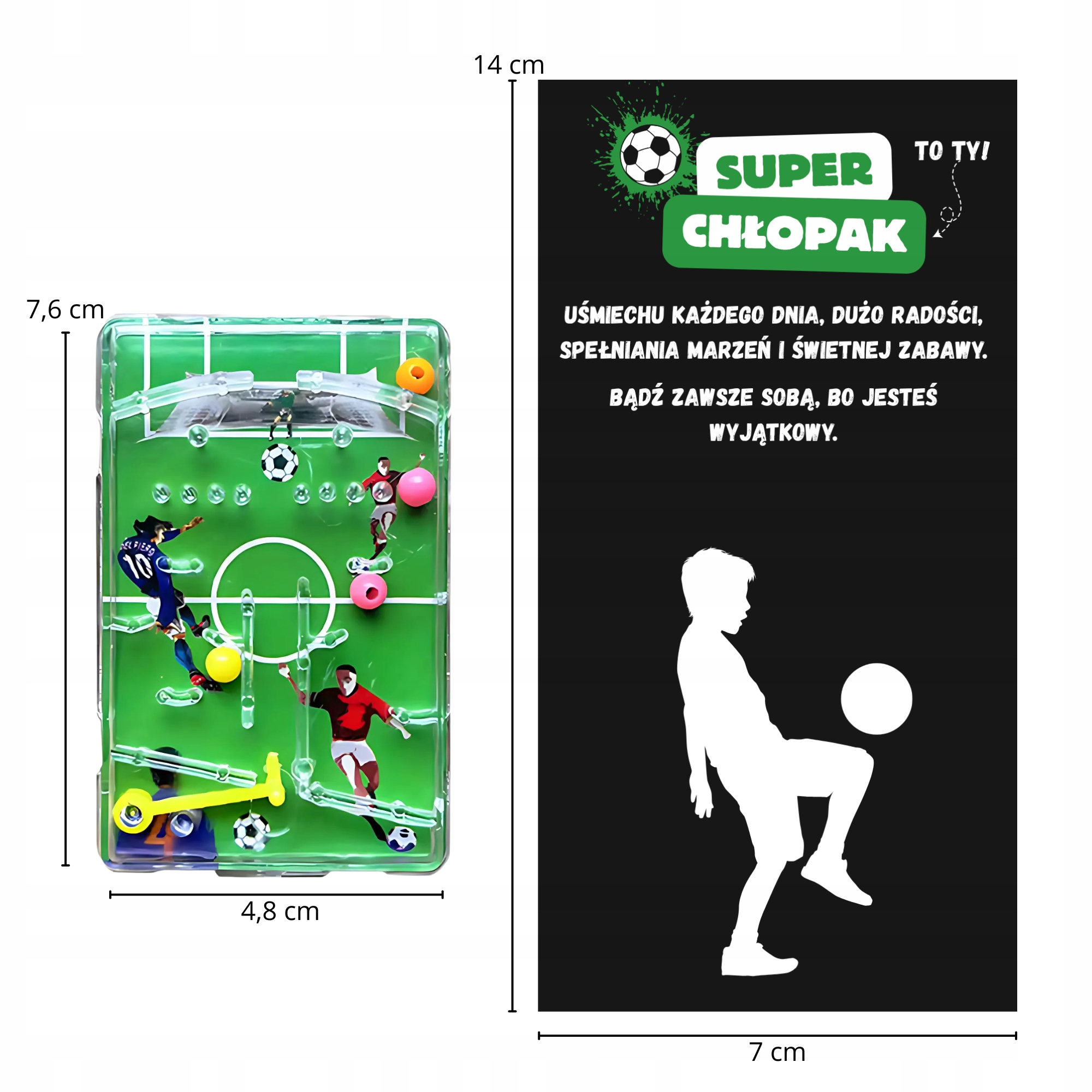☑ кишенькова аркадна гра з футбольним полем та барвистими кульками - чудова форма розваг для кожного маленького фанату футболу. Набір також включає карту з побажаннями та графікою "супер хлопця" , яка додасть чарівності кожному подарунку з нагоди його свята. Продукт поєднує просте задоволення з позитивним повідомленням - ідеально підходить для Дня хлопця!