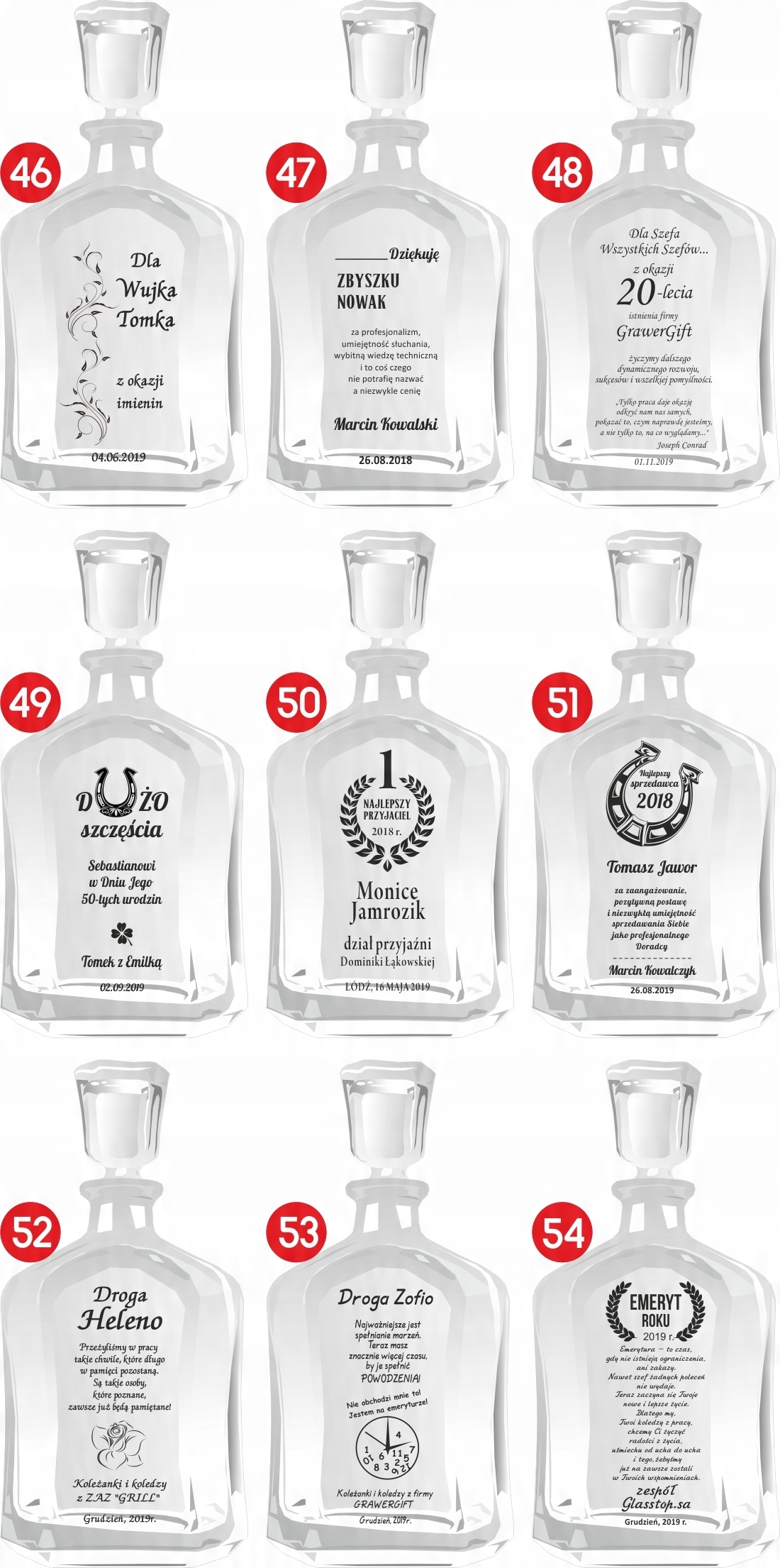 Ви думаєте, який подарунок вибрати в якості подяки своїм батькам або близьким? Збираєтеся на вечірку і не знаєте, що купити імениннику чи іменинниці? Цей графин стане ідеальним вибором! Графин зроблений вручну, що робить виріб унікальним. Виріб виготовлено з товстого скла і ідеально лежить у руці. Гравірування виконується на високоякісному лазерному плоттері, а це означає, що гравірування не відрізняється навіть на кількох придбаних виробах. Крім того, він наповнений вручну та дуже ретельно заповнений майстром спеціальною фарбою. Золота або срібна фарба дає дивовижний ефект після наповнення графина напоєм. Людина, яка отримає подарунок такої високої якості, неодмінно буде в захваті, а ви будете пишатися тим, що змогли йому це подарувати.