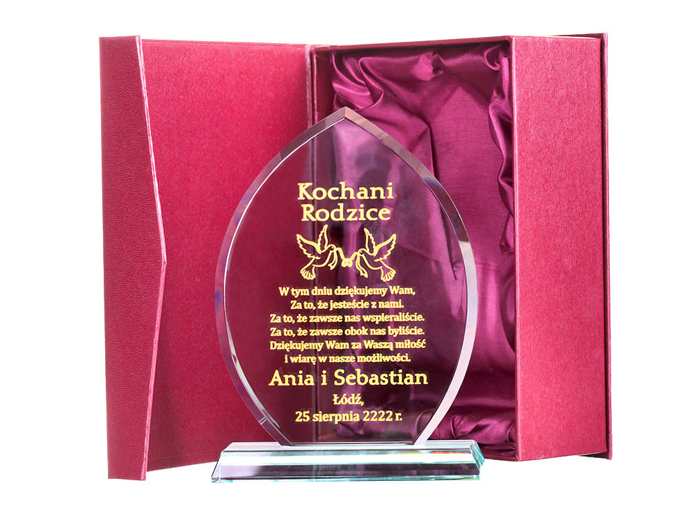 Красива подяка виготовлена за допомогою технології лазерного гравіювання безпосередньо на предметі. Скляна статуетка виглядає чудово завдяки інноваційній формі, а завдяки вирізам створює незабутнє естетичне враження. Встановлений на міцну основу з такого ж матеріалу, які міцно з'єднані між собою, він неодмінно запам'ятається одержувачу. Ви більше ніде не знайдете такої високої якості. Крім того, гравіювання наноситься майстром вручну і дуже акуратно спеціальною фарбою. Позолота/срібло переливається на світлі та дає дивовижний ефект. До всього доповнює красивий бордовий чохол з бордовим атласом, в якому статуетка виглядає ще красивіше, а позолота виділяється на тлі чохла. Можу зробити для вас - ПОДАРУНОК НА БУДЬ-ЯКИЙ ВИХІД (весілля, гостини, хрещення, причастя, день народження, вісімнадцяти іменини, ювілей, річниця весілля, день матері та батька, день дідуся та бабусі, день Святого Валентина, день вчителя, тощо). b>