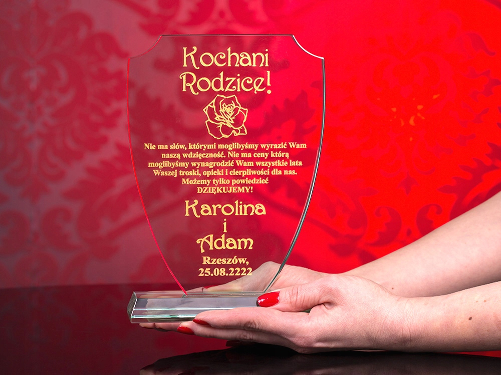 Красива подячна записка виготовлена за допомогою технології лазерного гравіювання безпосередньо на предметі. Скляна статуетка виглядає чудово завдяки інноваційній формі, а завдяки вирізам створює незабутнє естетичне враження. Встановлений на міцну основу з такого ж матеріалу, які міцно з'єднані між собою, він неодмінно запам'ятається одержувачу. Ви більше ніде не знайдете такої високої якості. Крім того, гравіювання наноситься майстром вручну і дуже акуратно спеціальною фарбою. Позолота/срібло переливається на світлі та дає дивовижний ефект. До всього доповнює красивий бордовий чохол з бордовим атласом, в якому статуетка виглядає ще красивіше, а позолота виділяється на тлі чохла. Можу зробити для вас - ПОДАРУНОК НА БУДЬ-ЯКИЙ ВИХІД (весілля, гостини, хрещення, причастя, день народження, вісімнадцяти іменини, ювілей, річниця весілля, день матері та батька, день дідуся та бабусі, день Святого Валентина, день вчителя, тощо). b>