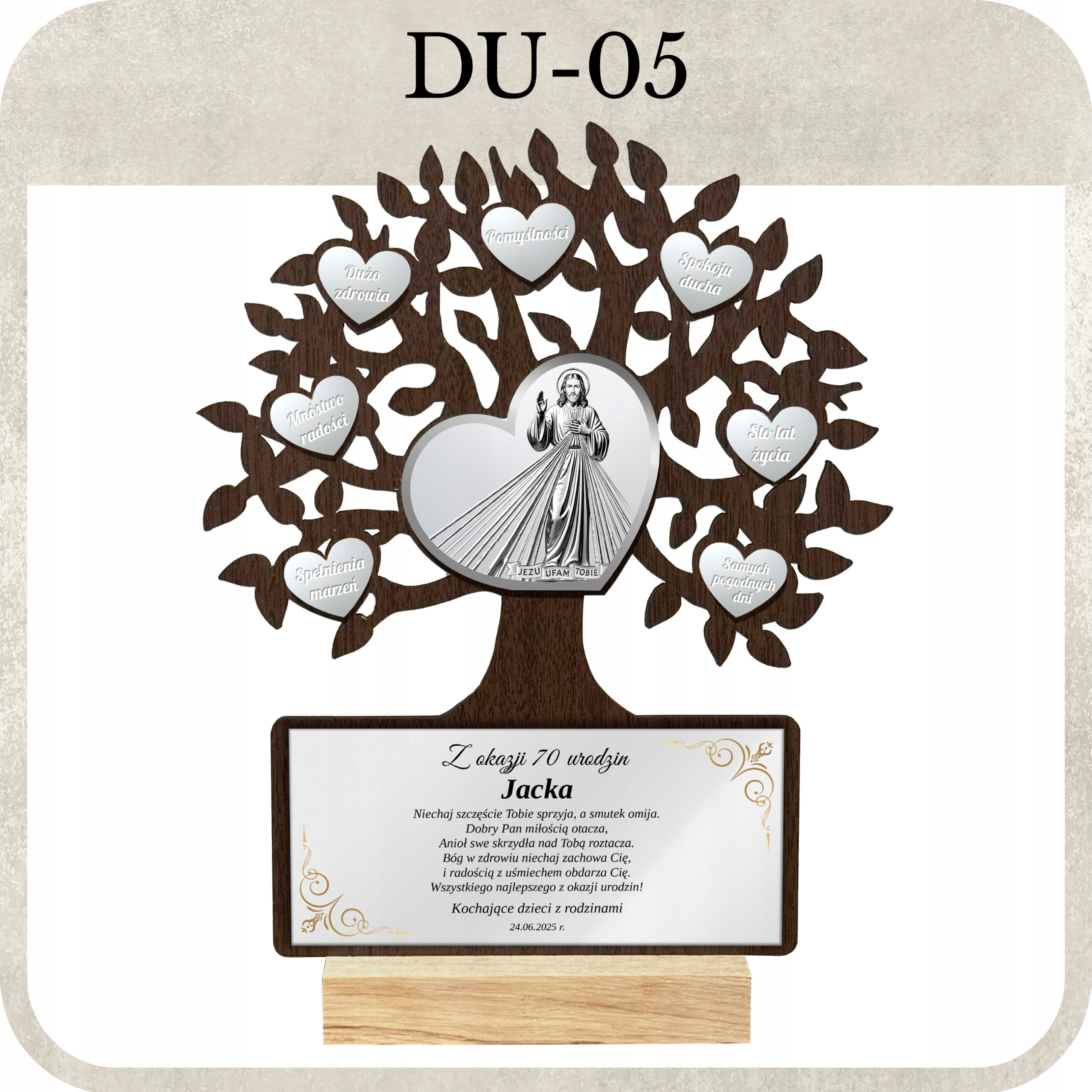 Ошатне Дерево Щастя із зображенням Ісуса Милосердного - унікальний подарунок до ювіляра. Виготовлений з масиву МДФ, з красивими деталями і дзеркальним покриттям, він стане чудовим сувеніром для батьків, бабусь і дідусів або близьких. Завдяки персоналізованим елементам, таким як срібна табличка з присвятою, подарунок стає унікальним і адаптованим до події.