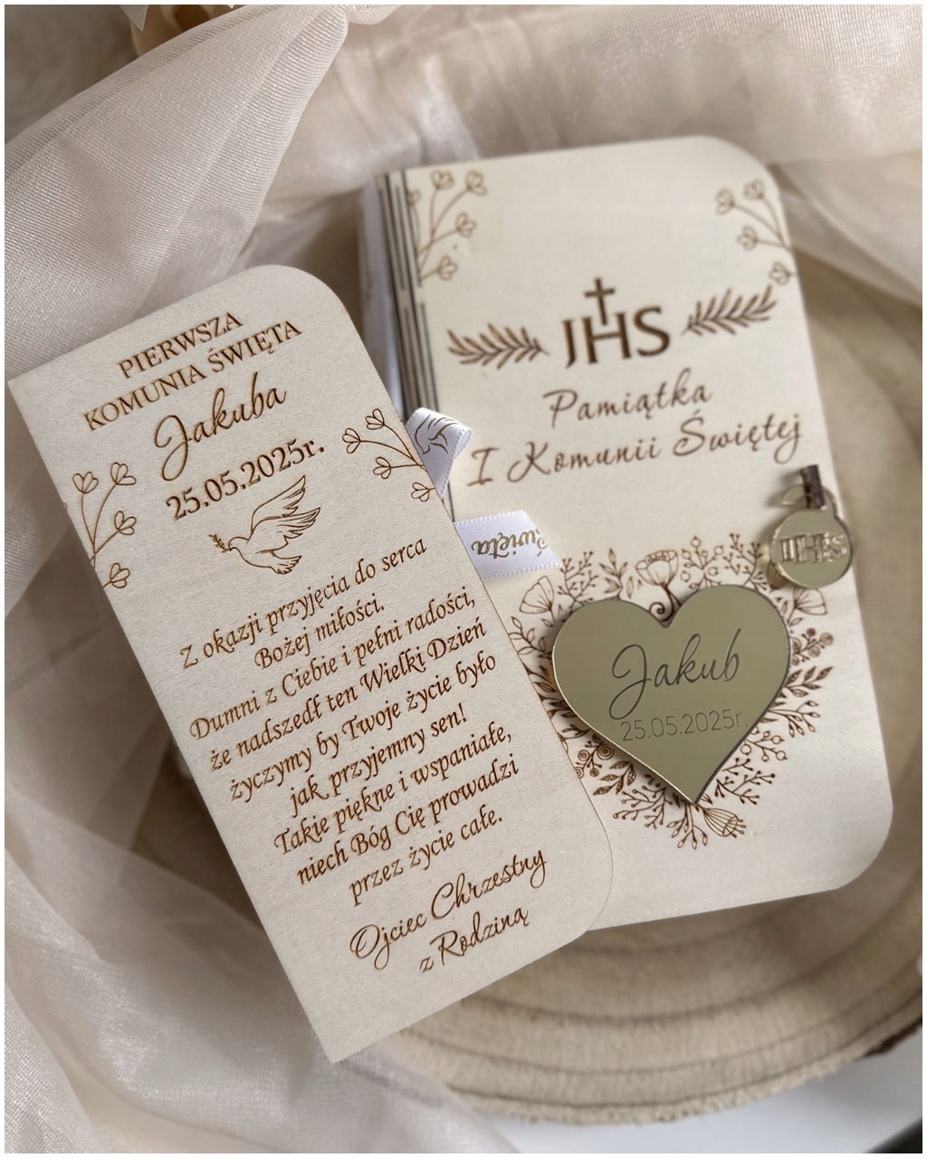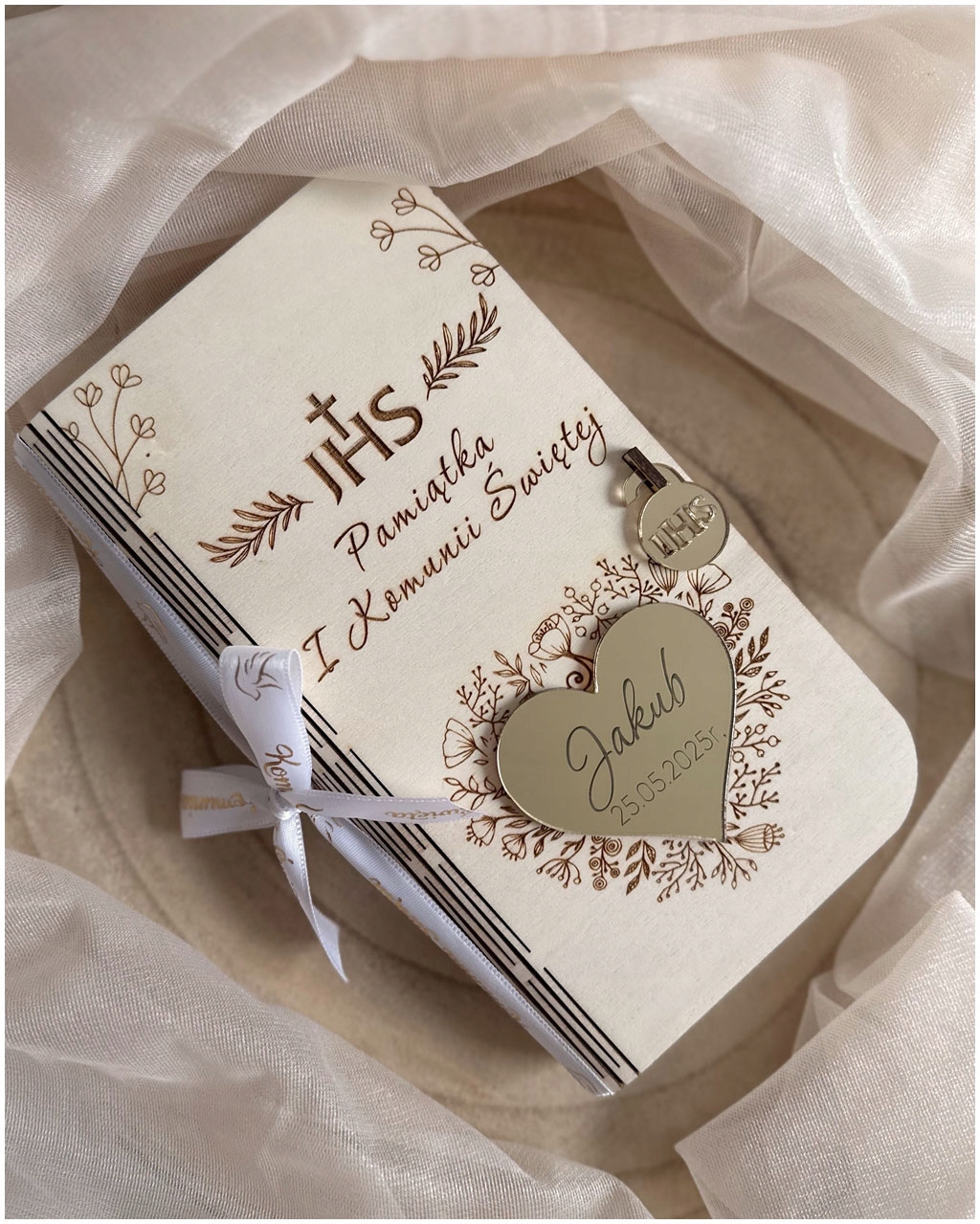 сувенір Святого Причастя у вигляді оригінальної дерев’яної коробки - це унікальна ідея для подарунка з нагоди першого святого спілкування . Продукт виготовлений з дерев’яної фанери, золотого дзеркального серця та красивої причастяної стрічки . Середина серця Дзеркало Ім'я дитини гравірованою та дата церемонії .
