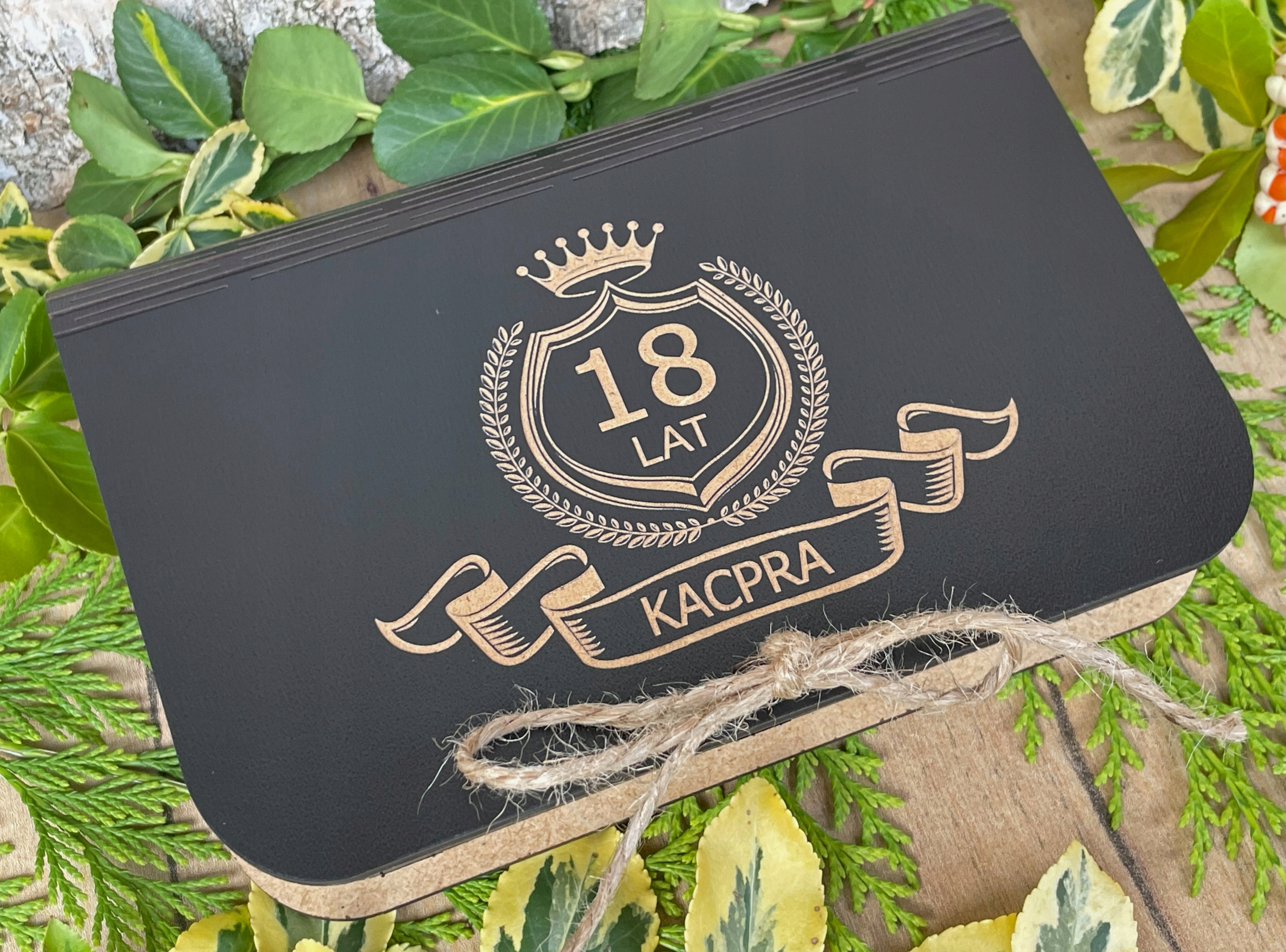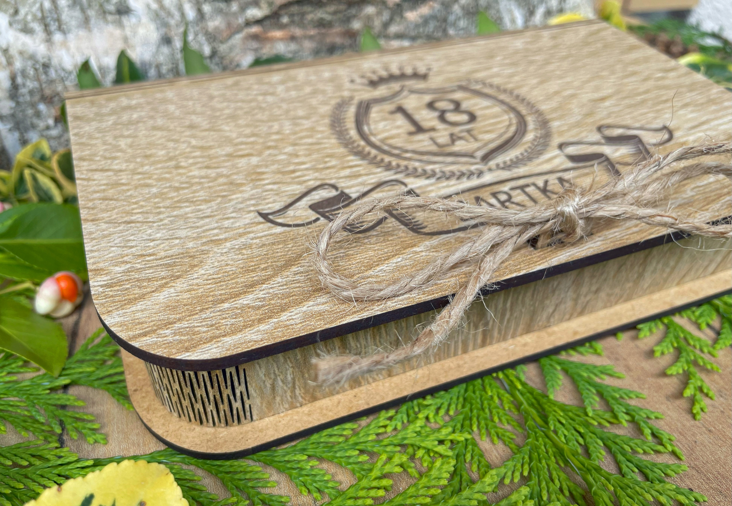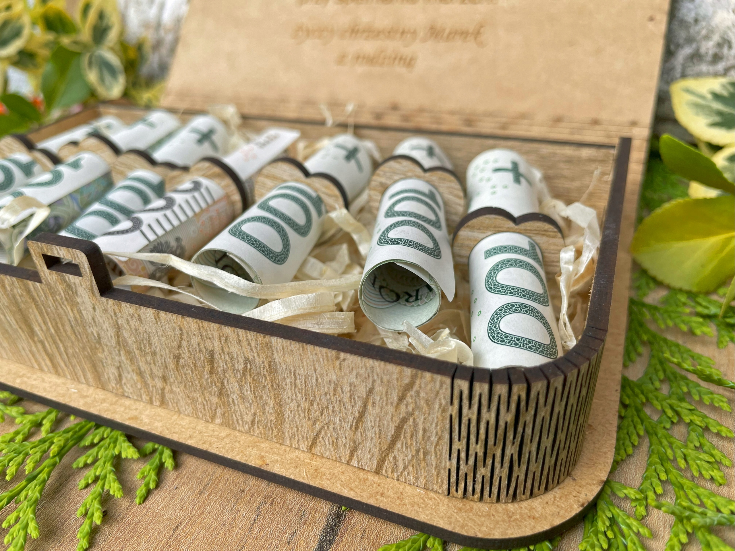 Красива дерев’яна коробка з гравіруванням на гроші чи іншим подарунком з нагоди народження чи річниці.