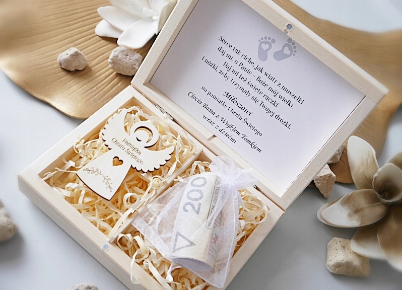 - У вартість входить: шкатулка з гравіюванням, магнітик янголятко, стрічка для обгортання сувеніра та мішечок для банкнот або подарунковий такий як ланцюжок, сережки тощо.