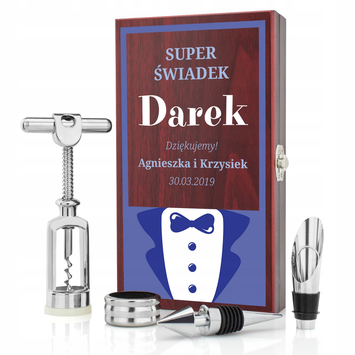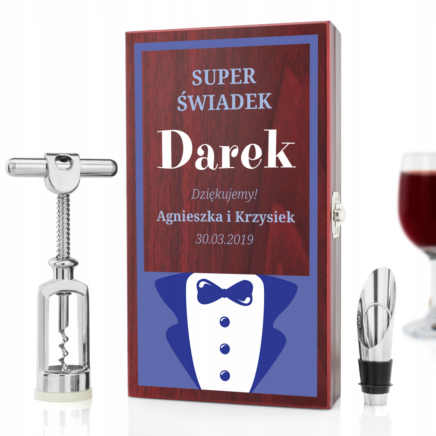 Подаруйте своєму свідку цей елегантний винний набір із 4 предметів у дерев'яній коробці. На кришці коробки є персоналізований принт, це безсумнівно нагадує про цей особливий день, це практичний подарунок, який порадує кожного любителя вина!