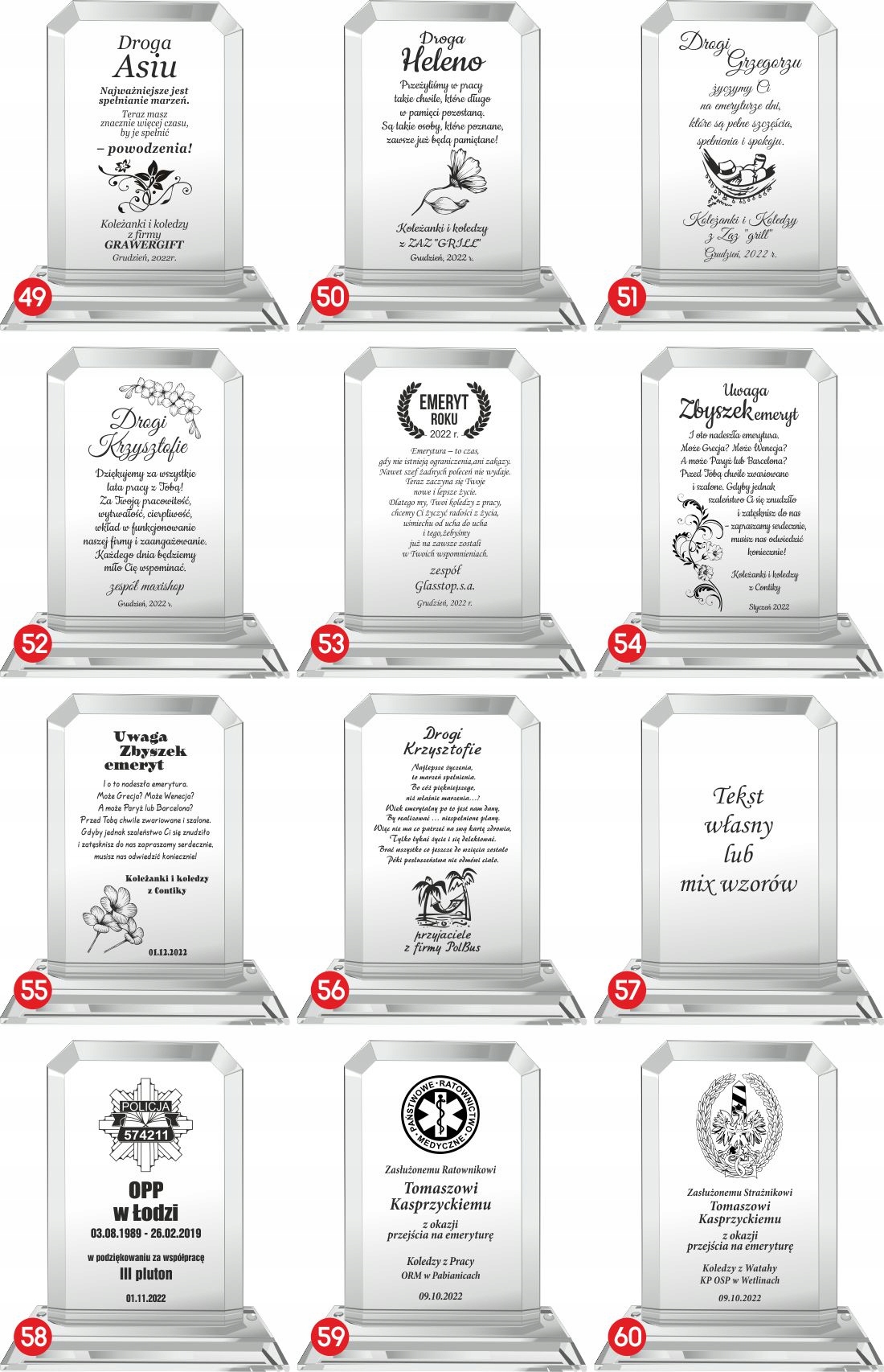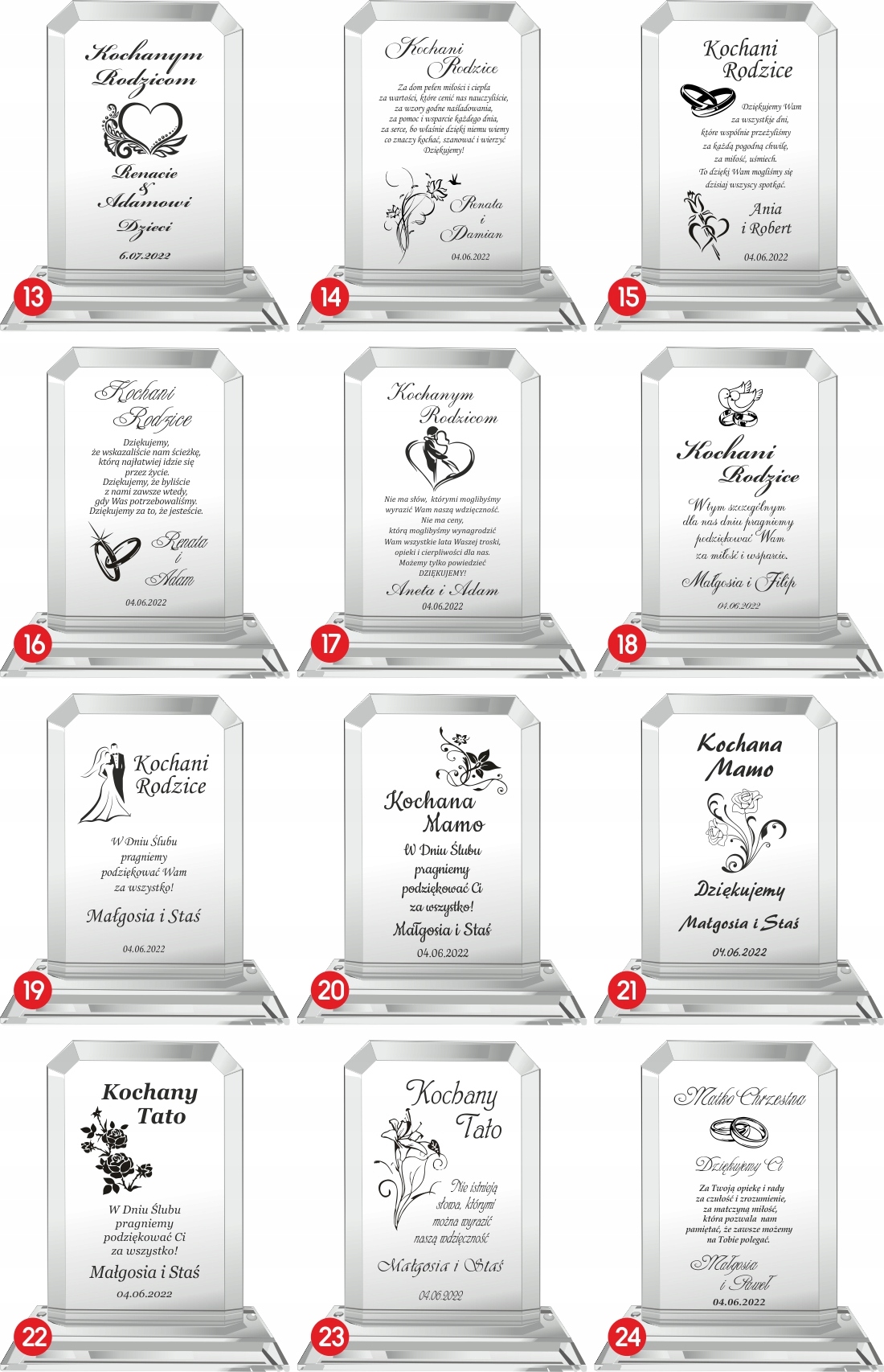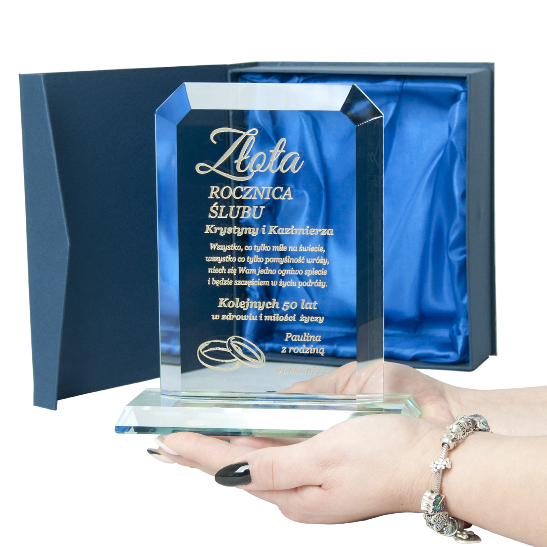 Якщо ви не відповідаєте надісланому нами шаблону інформації, ми не несемо відповідальності за будь-які помилки в гравіюванні. Тексти та варіанти можна вільно змінювати на свій розсуд (тексти, окрім тих, що є в наших варіантах, слід переписати на комп’ютері та надіслати нам, наприклад, у блокноті). Числа річниці є прикладами та можуть бути змінені. Тексти, надіслані у вигляді знімків екрана чи фотографій, не будуть транскрибовані. Потрібно надати транскрибований текст. Продавець повідомляє, що вироби зі скла можуть містити дрібні повітряні бульбашки та подряпини на поверхні, що є результатом виробничого процесу.