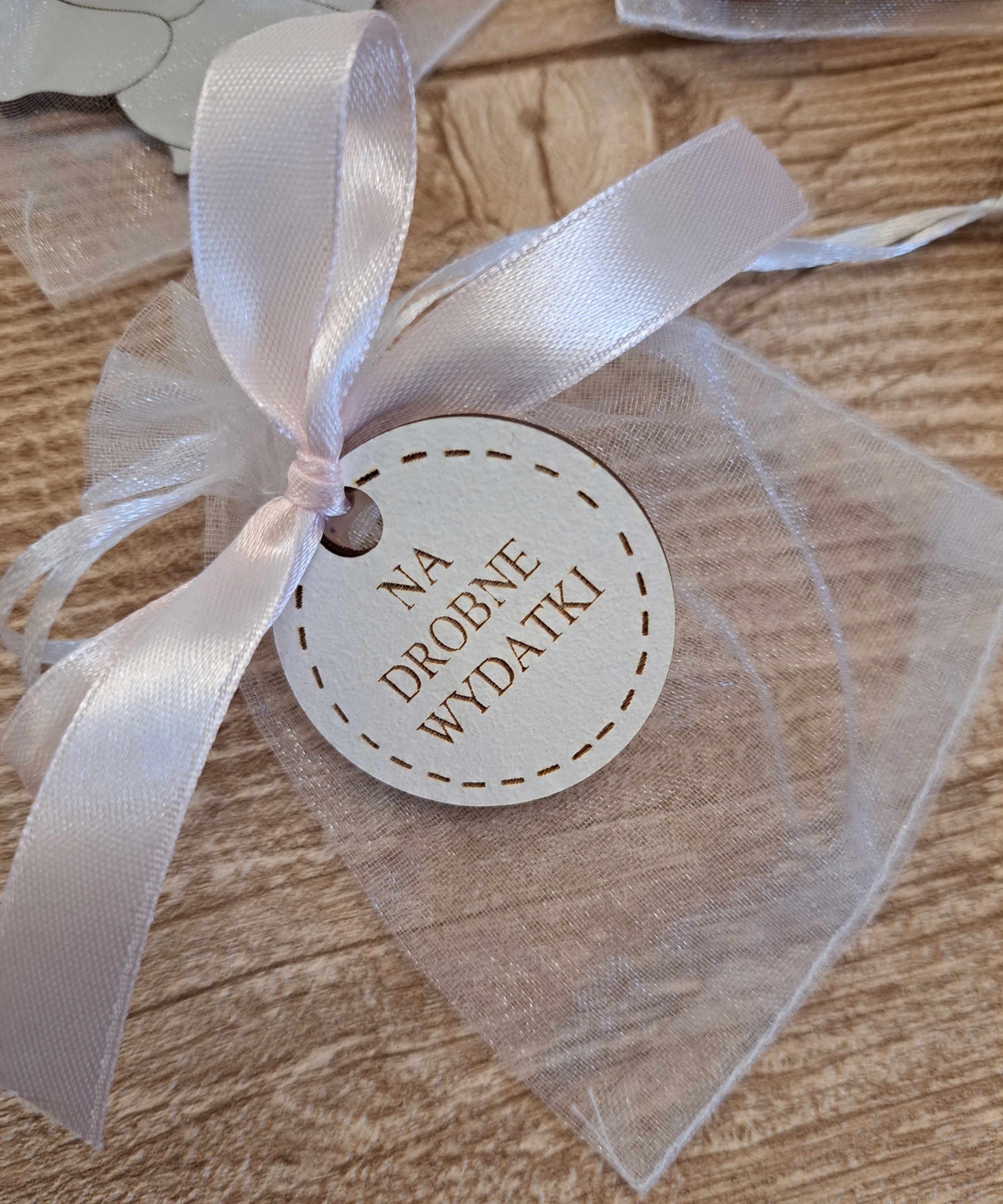 У коробці 6 пакетиків з декоративними рожевими бантами, до яких прикріплені дерев'яні підвіски з написами: