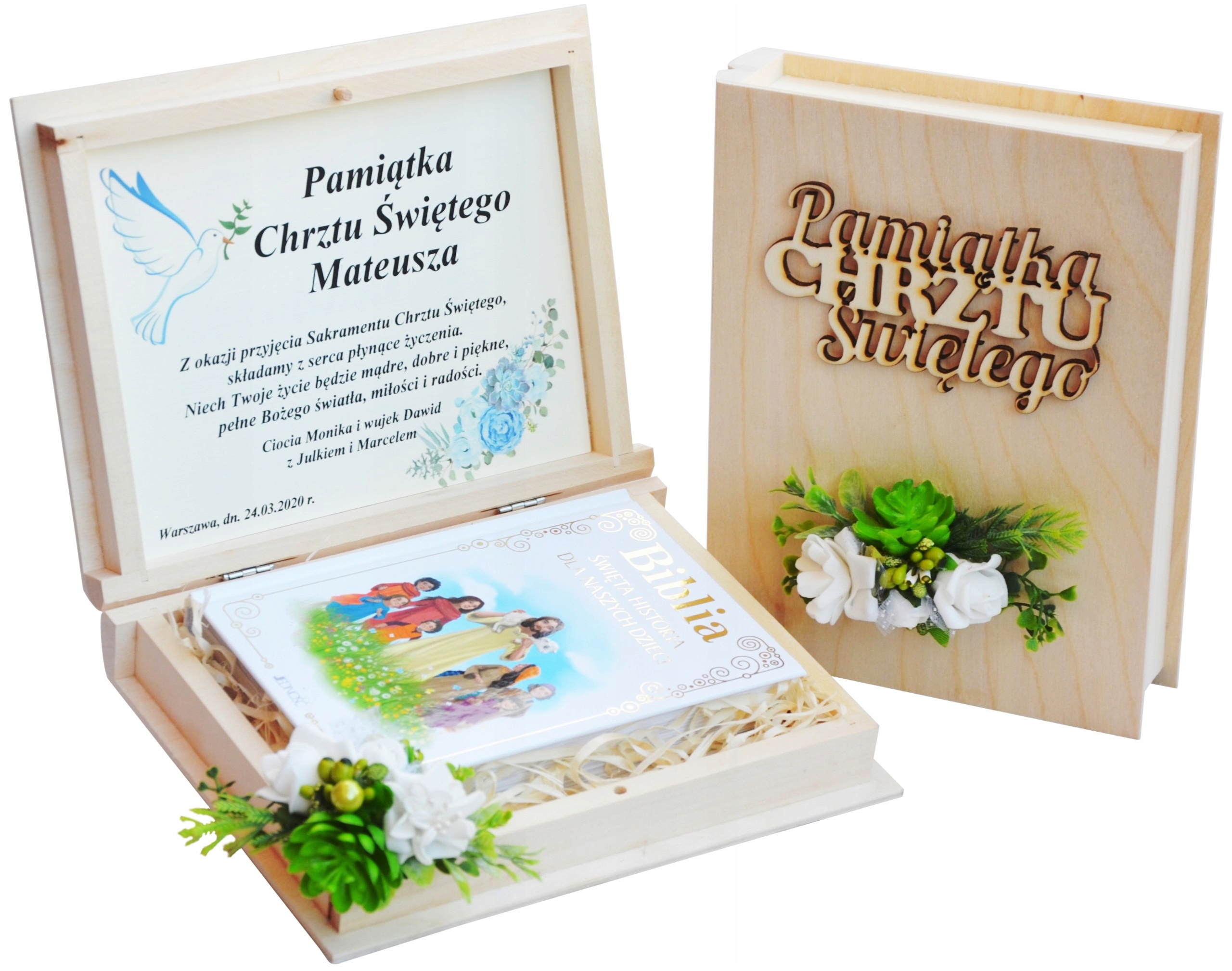 Унікальний і красивий набір: ілюстрована Біблія в дерев'яній коробці з персоналізацією та букет рушників - чудовий подарунок на Святе Хрещення - практичний та оригінальний.