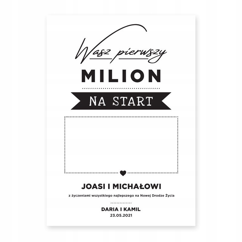 - Рамка формату А4 із запискою з написом Your first million to start, іменами нареченого та нареченої та інформацією про те, хто дарує подарунок, підготовлена для передачі готівки в день весілля