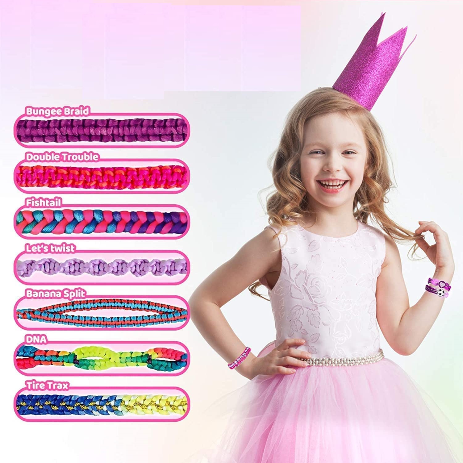 Набір для виготовлення браслета дружби для дівчаток «зроби сам» містить рухомі шпильки та плетене крісло, щоб тримати браслет на місці, щоб нитки були розділеними та організованими. Дівчата можуть вибрати різні кольори плетених ниток, щоб створити унікальні браслети.