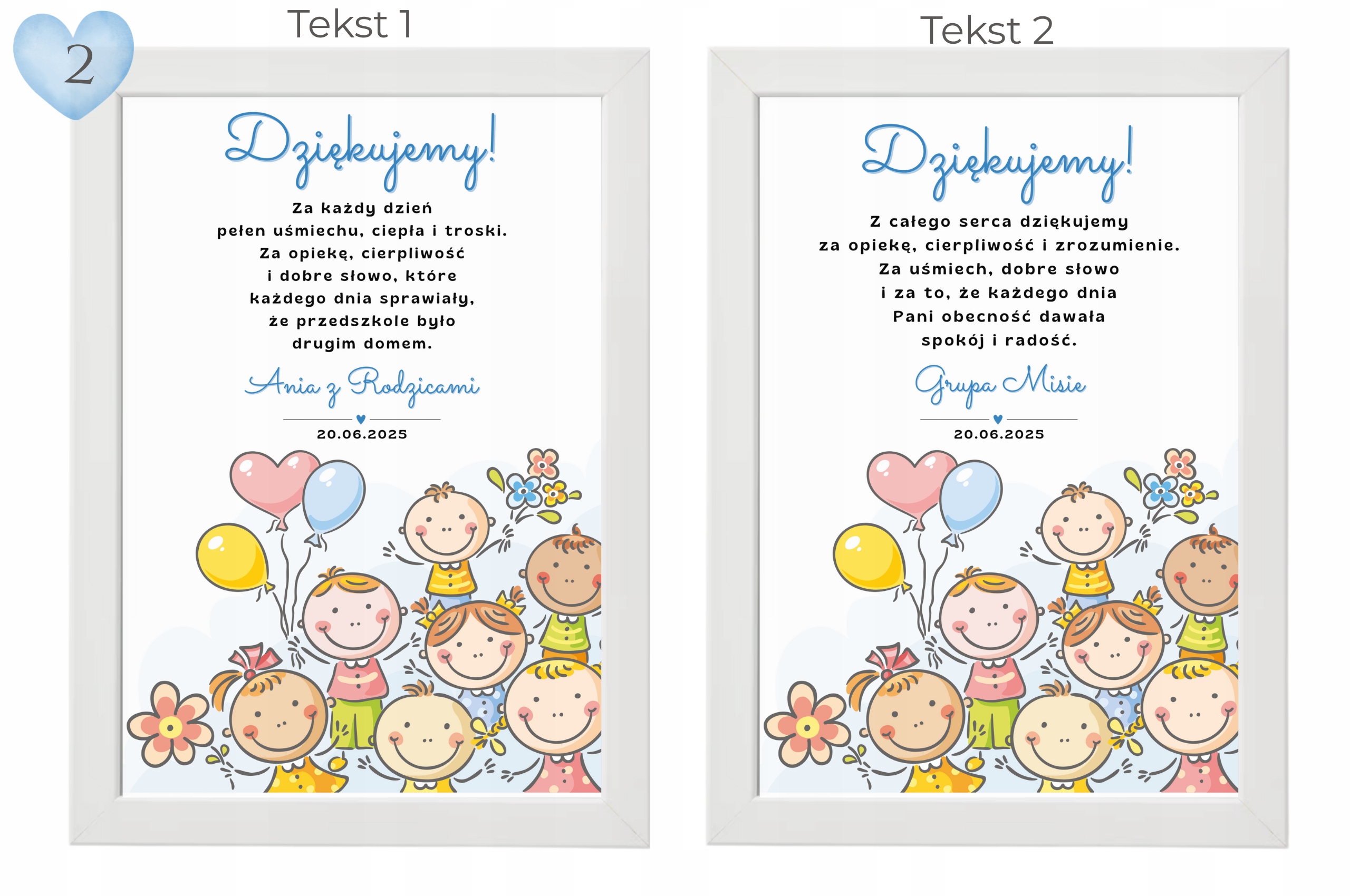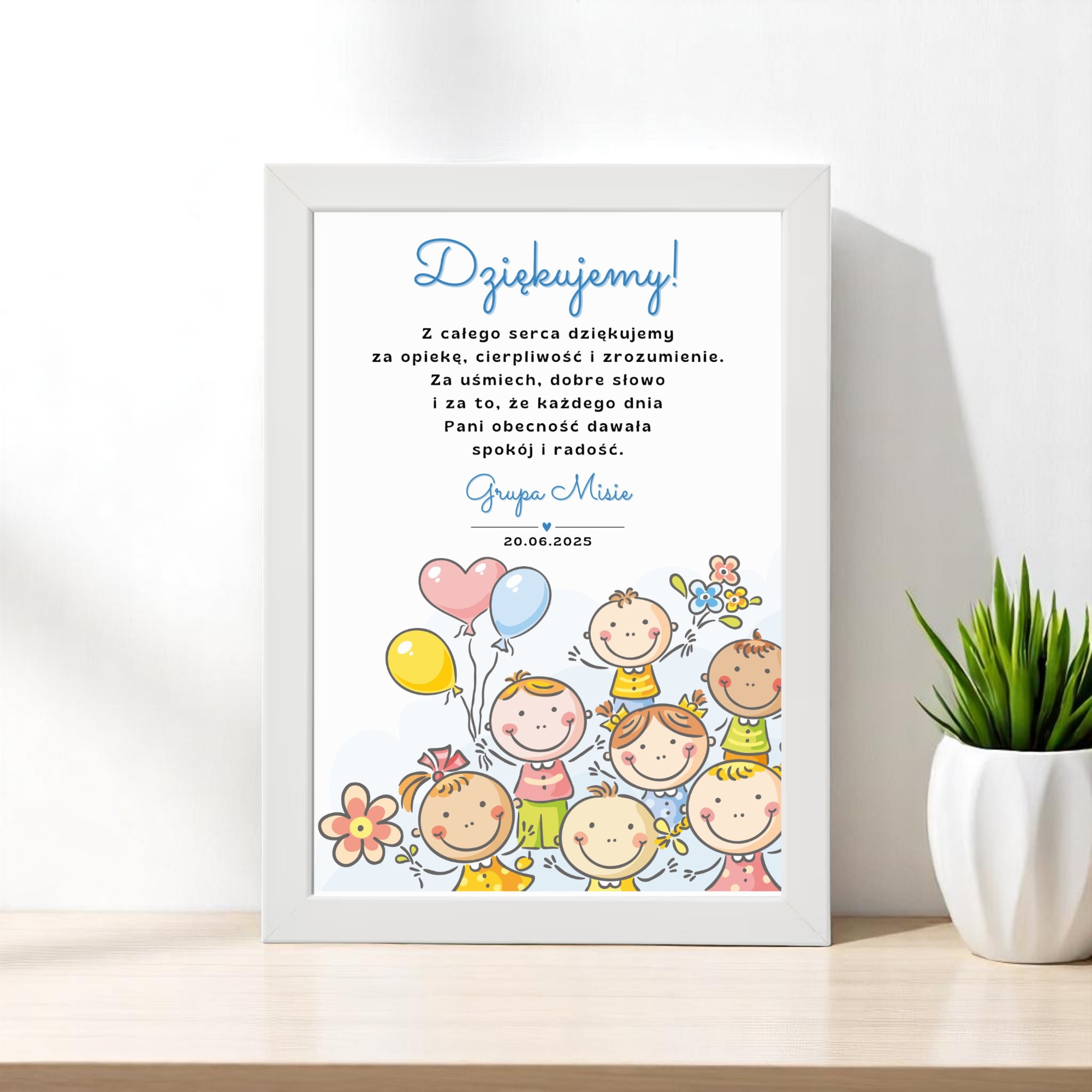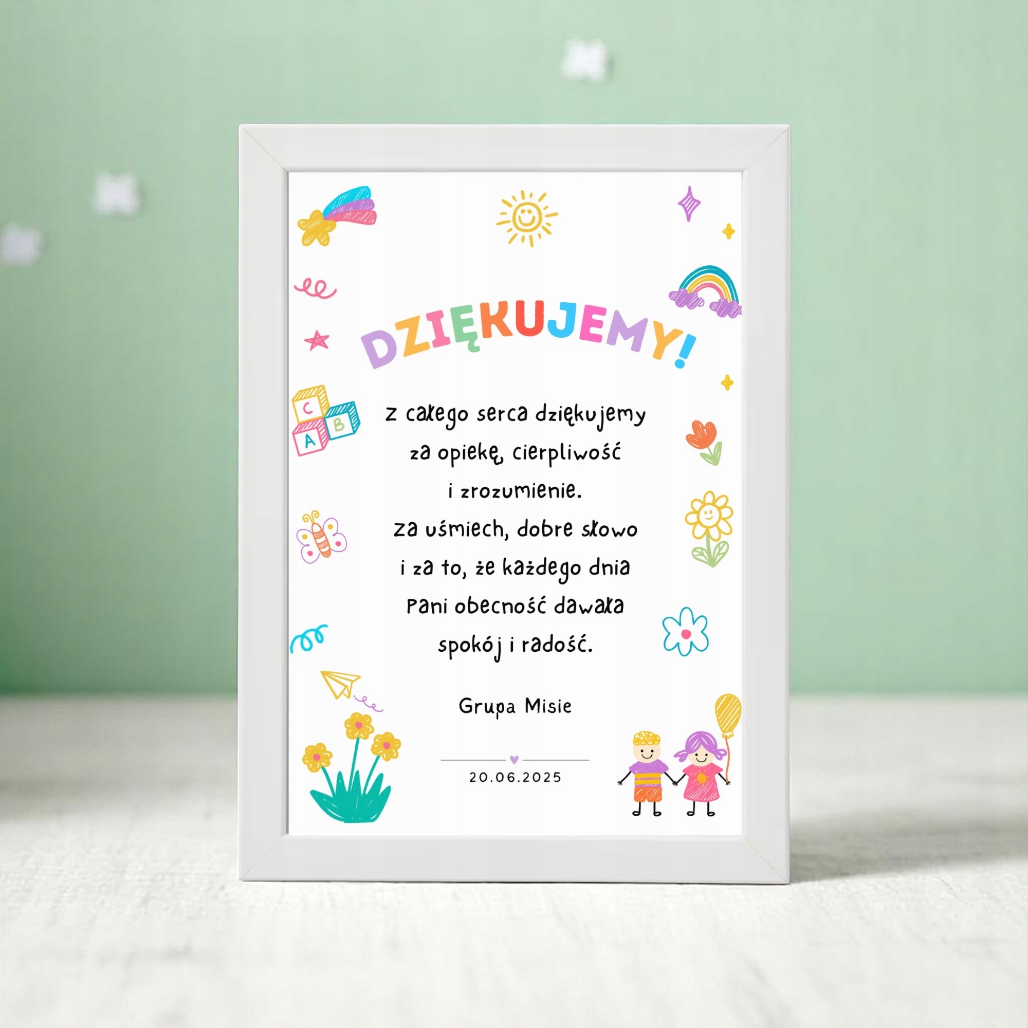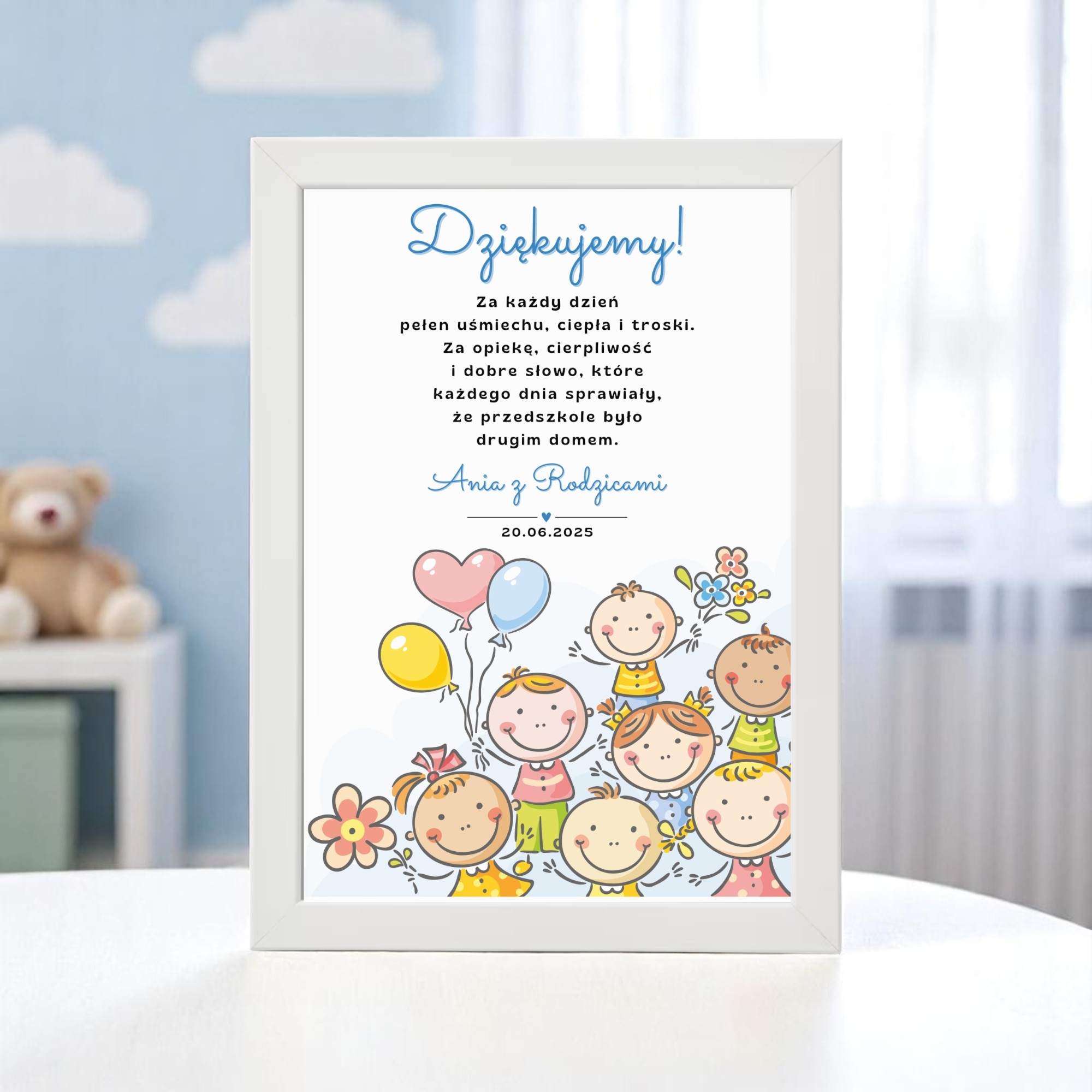 - Персоналізація: Ім'я дитини чи групи, підпис (наприклад, "з батьками" або "Biedronka Group"), дата, також можливість повної зміни завдяки вашому власному