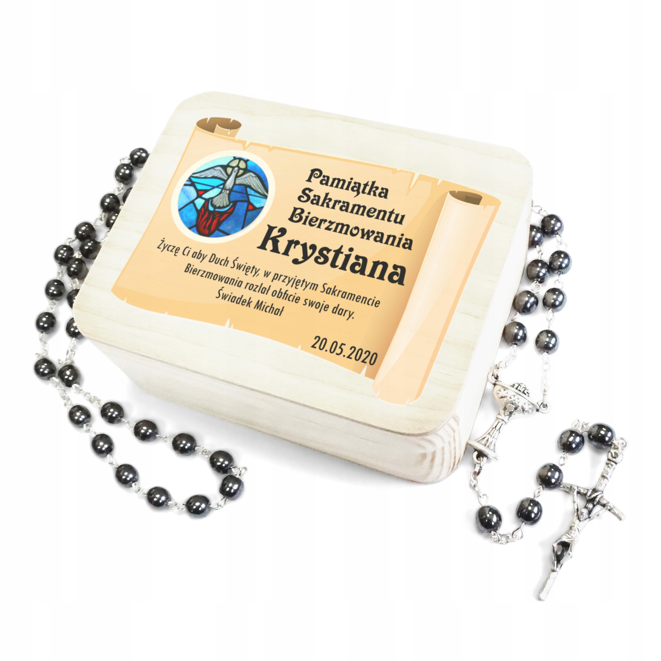 Сувенір на прийняття Таїнства Миропомазання - вервиця в дерев'яній коробці з принтом.