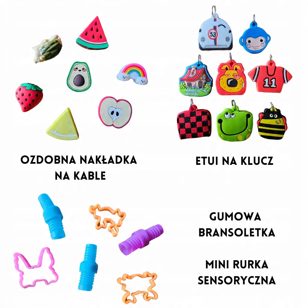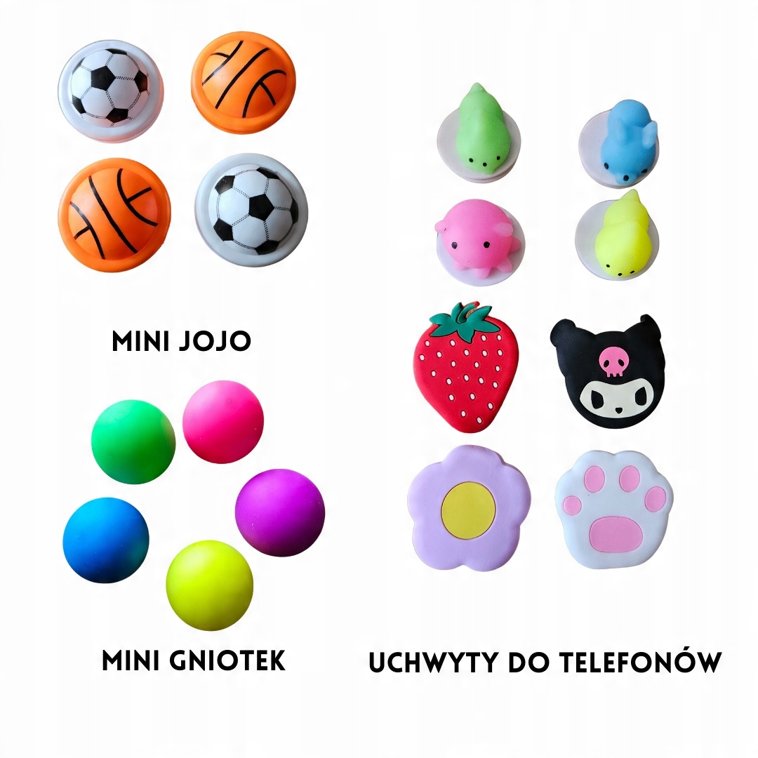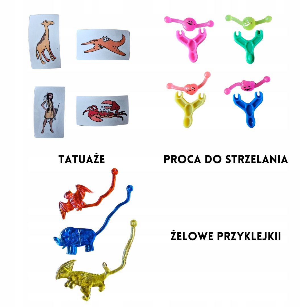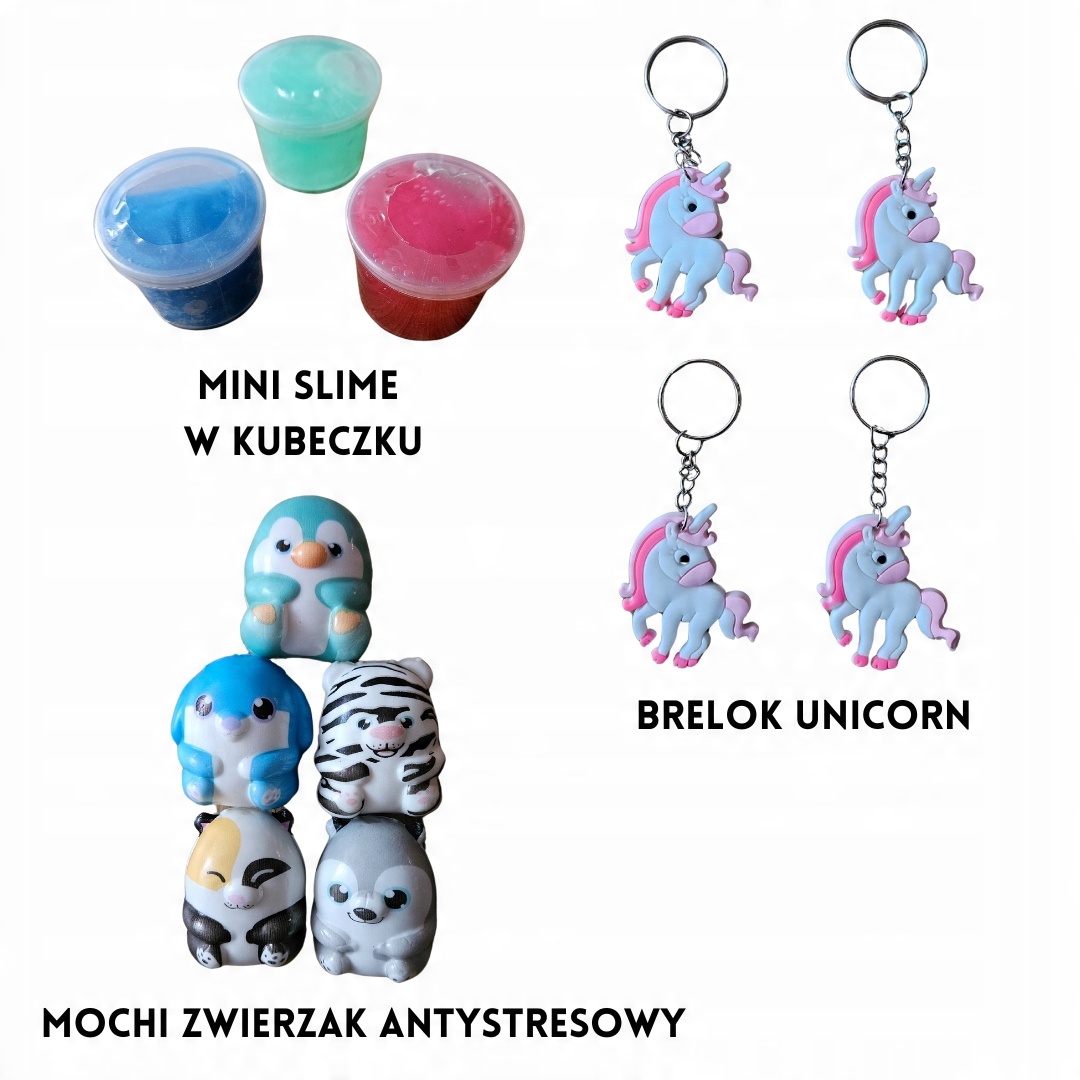 Нижче наведено зразки фотографій подарунків, у тому числі тварин із бісеру, міні-пружин, моті, кулонів, брелоків, ручок, пов’язок, татуювань, каблучок, намиста, йо-йо, рогаток, м’ячів для м’яча, гумових м’ячів, яєць динозаврів, кабелю чохли, тримачі для телефону, pop-it, слайм, гелеві кубики, розтягуються твариниі багато іншого.