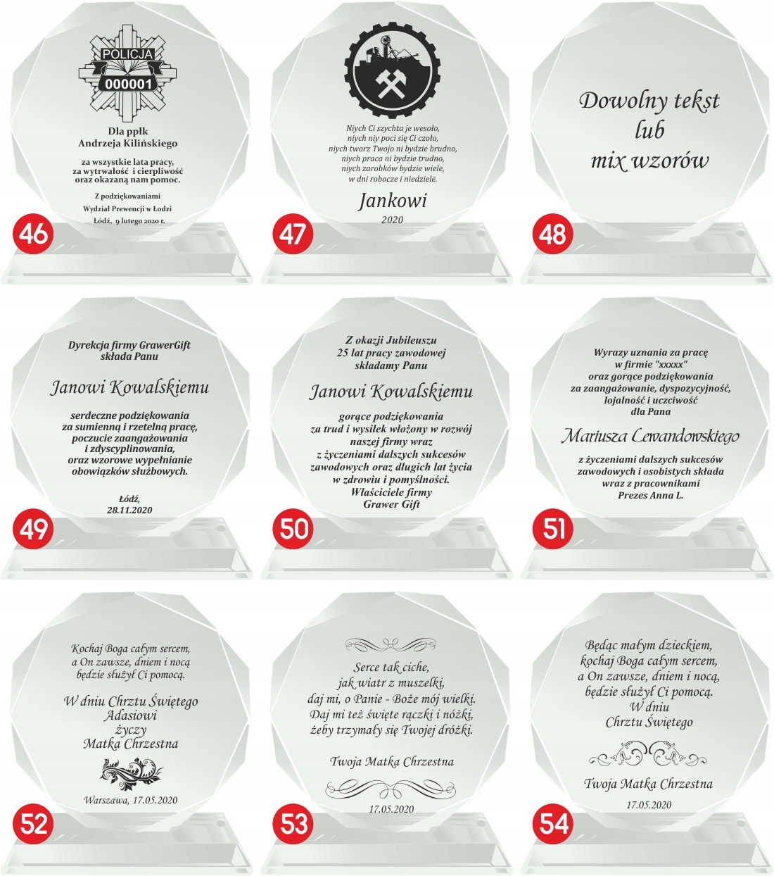 Ми є провідним виробником гравірованих подарунків на ринку Лодзі. Наш пріоритет - якість гравірування та швидкість виконання замовлення. Це підтверджується нашими коментарями, а також частими замовленнями для авторитетних компаній, які працюють по всій Польщі, а також державними замовленнями.