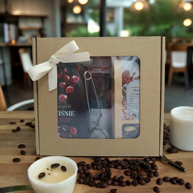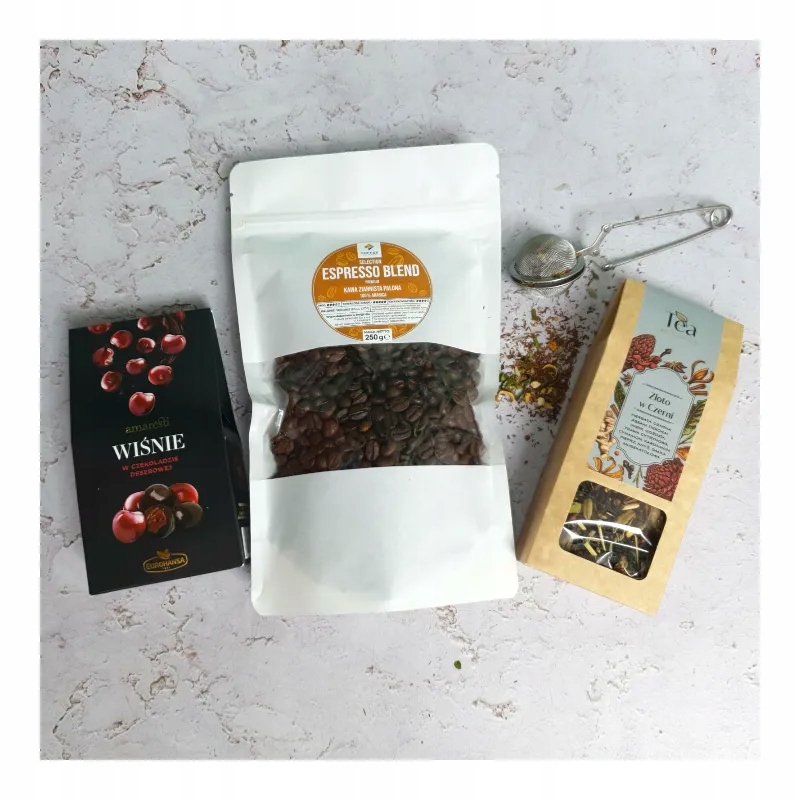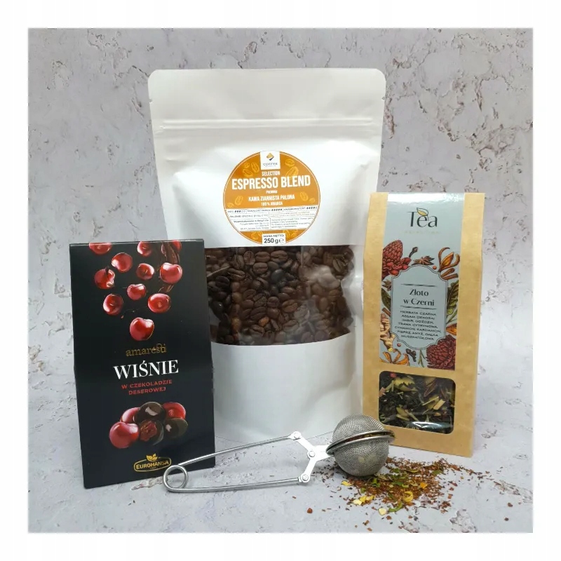 - У набір входить: - Вишні в темному шоколаді Amaresti (80г) - Чорний чай із "Golden" «Добавки в чорному» (50 г) - Чайне ситечко з нержавіючої сталі - Кава в зернах Selection Espresso Blend 100% Arabica (250 г)