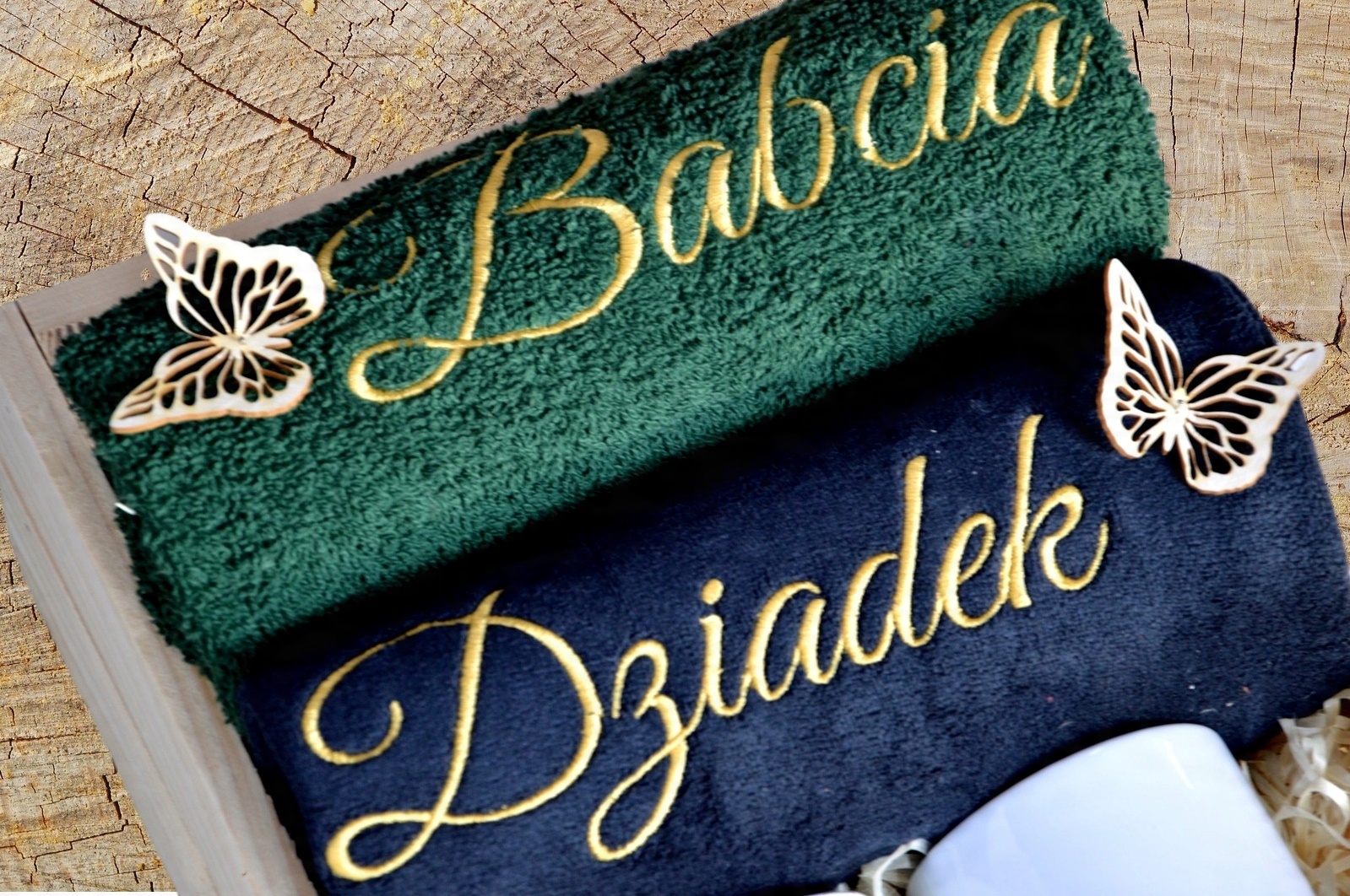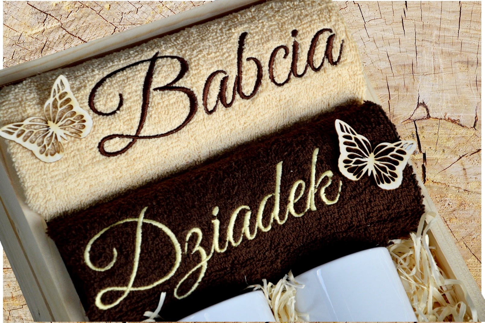 НАБІР: Рушники з кухлями В ДЕРЕВ'ЯНІЙ ШКАБЛІ