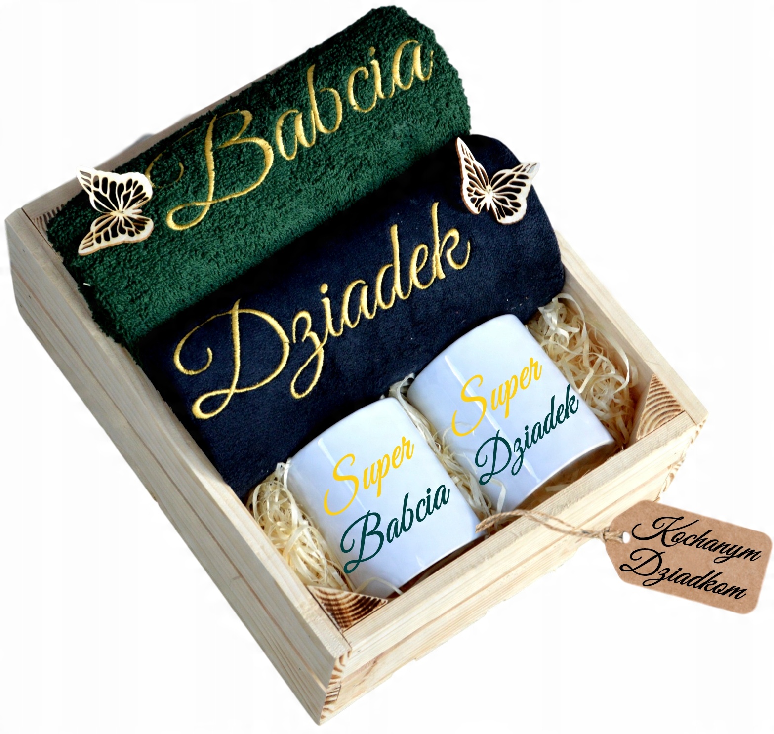 з вишивкою «Бабуся/Дідусь» на рушниках та написом на кухлях