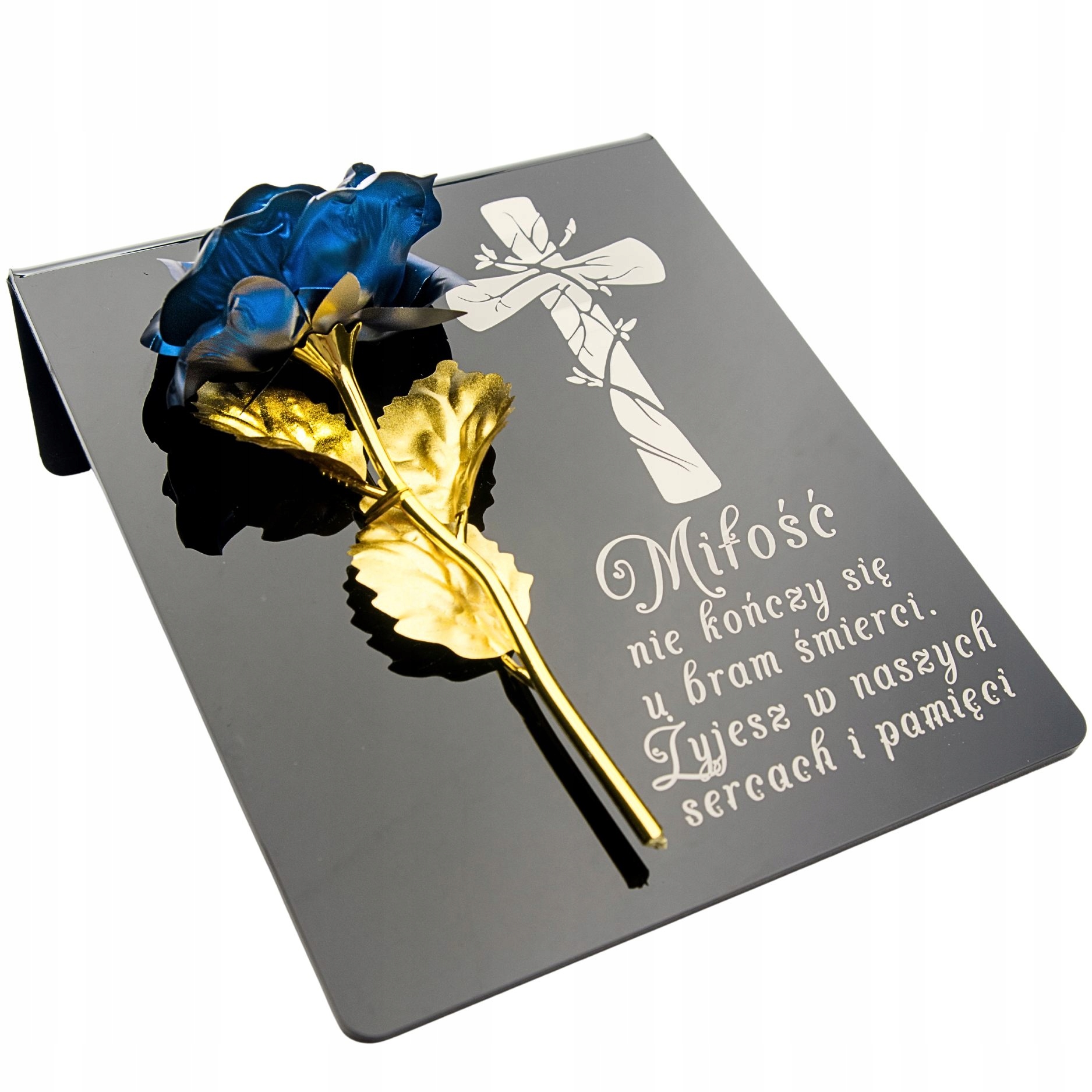 Синя золота троянда на п’єдесталі з гравюром