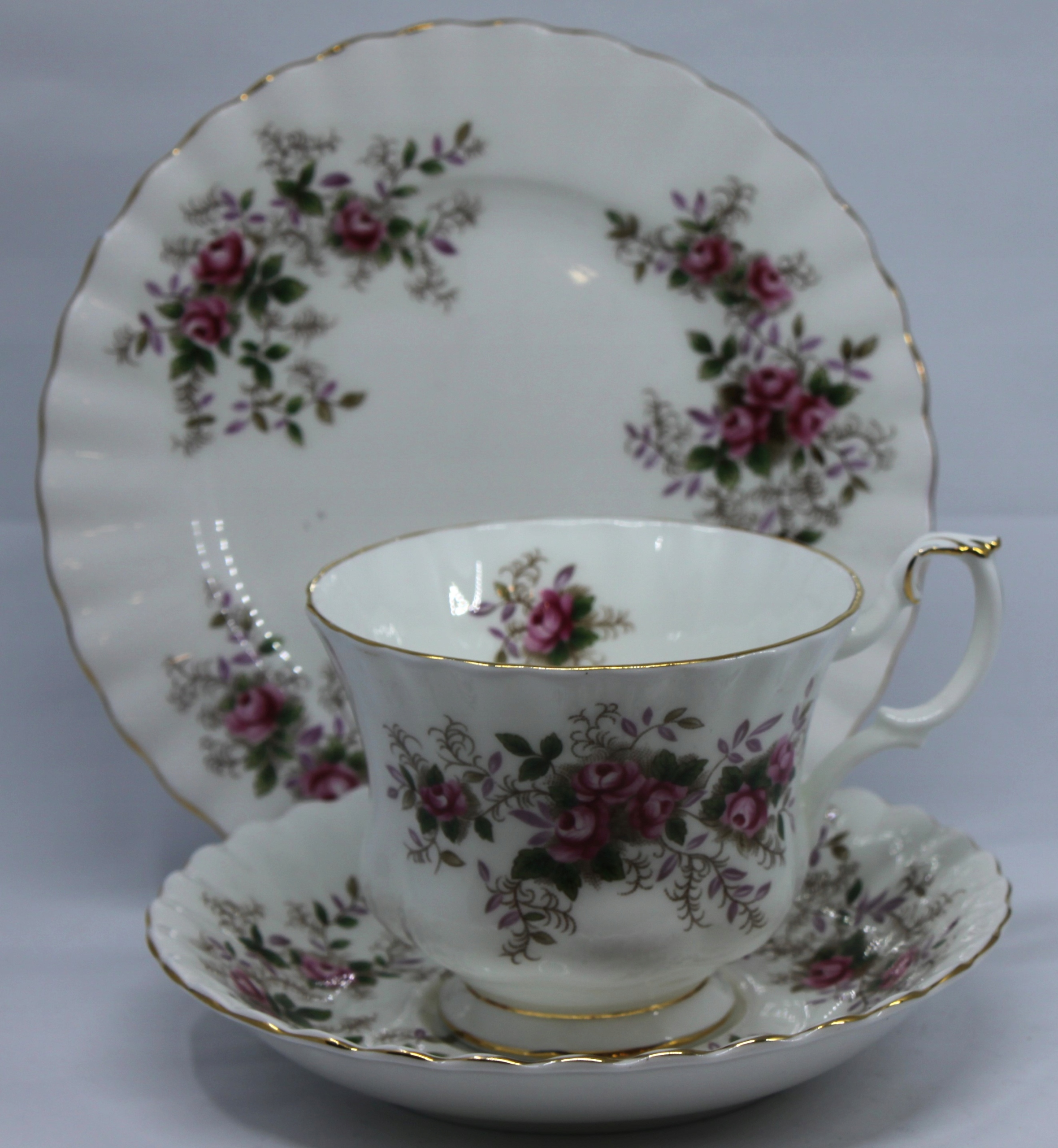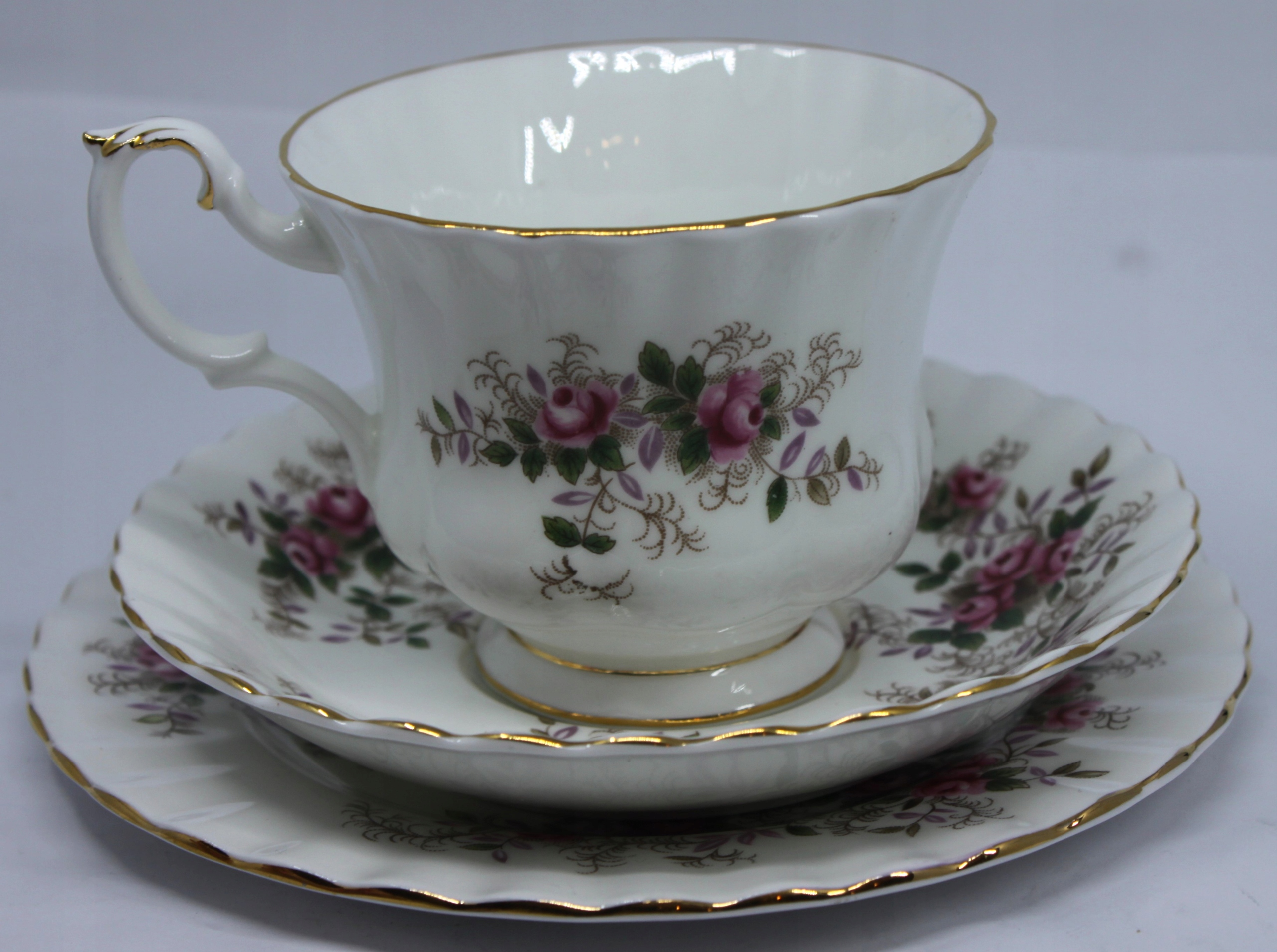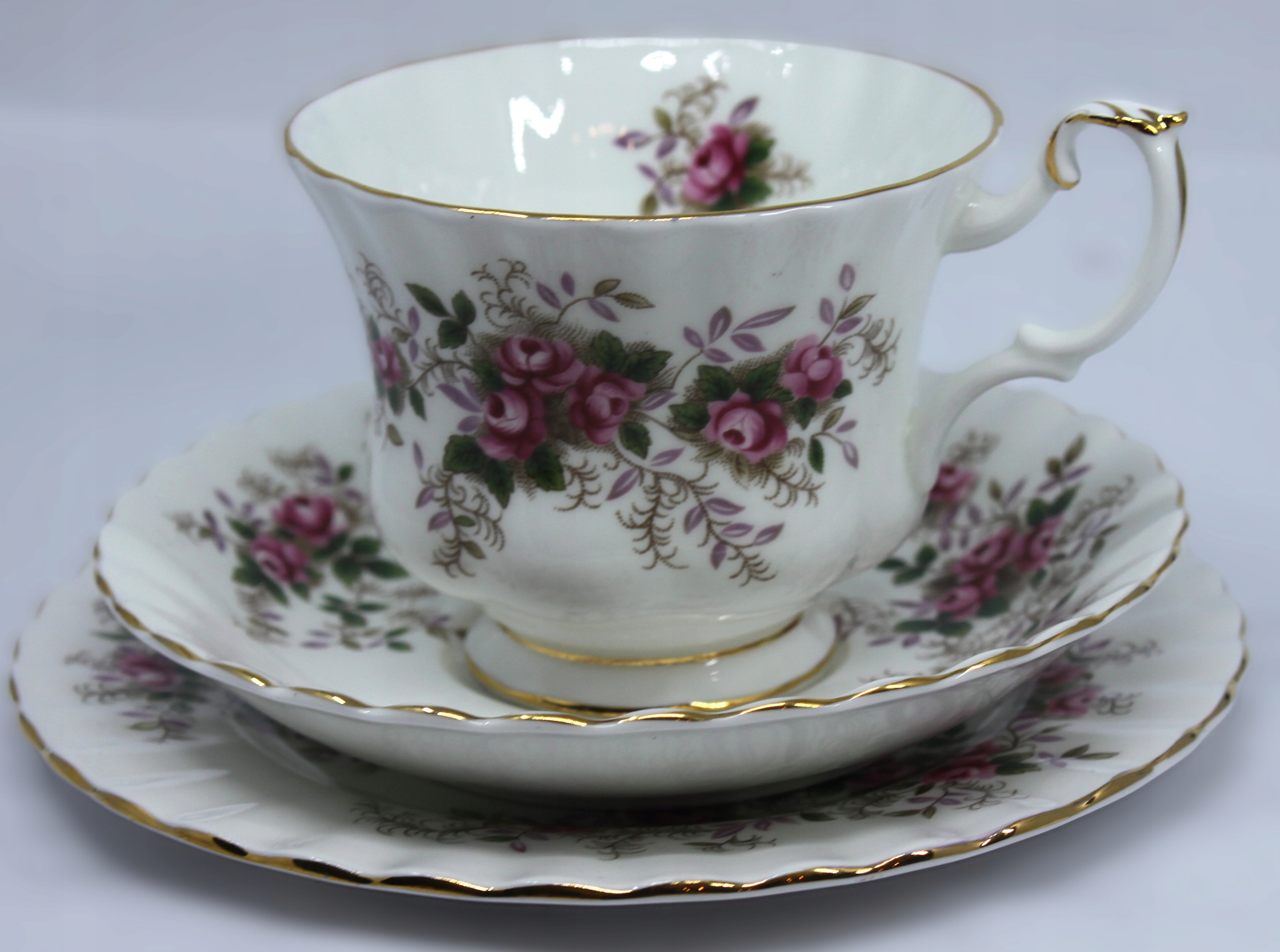 чашка з блюдцею та тарілкою, виготовленою з королівського фарфору з кісткою, закінченою 22 каратним золотом, візерунок лавандової троянди