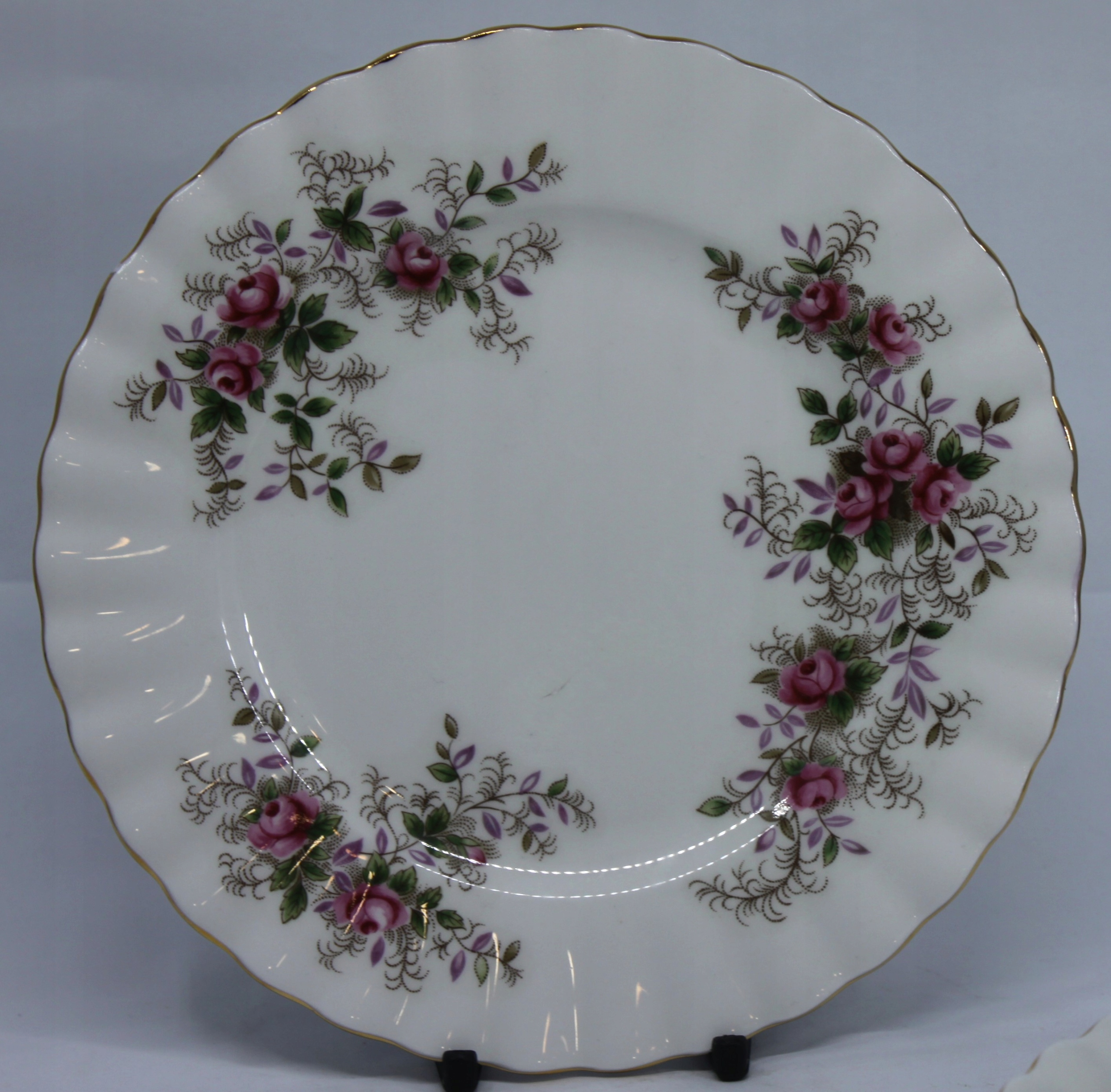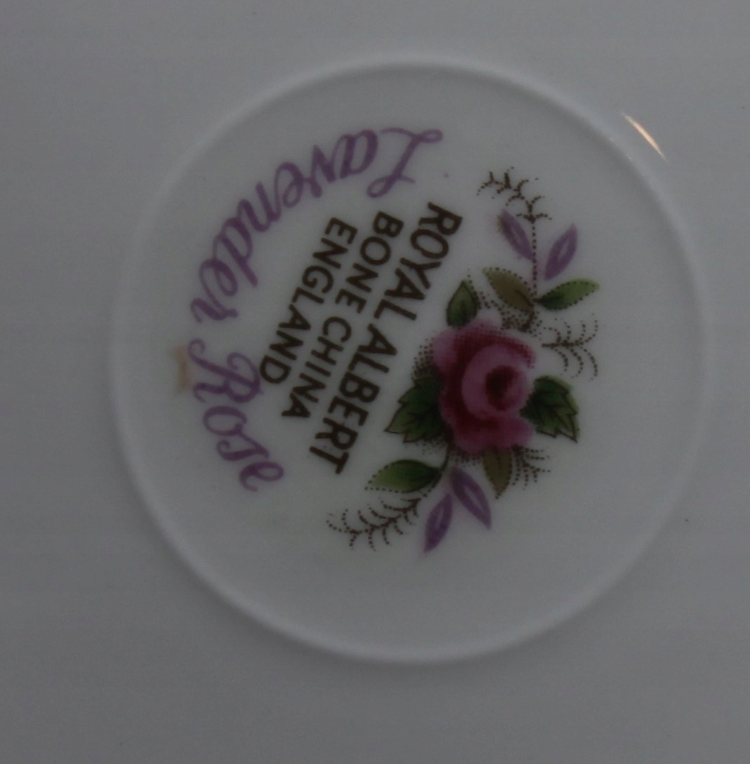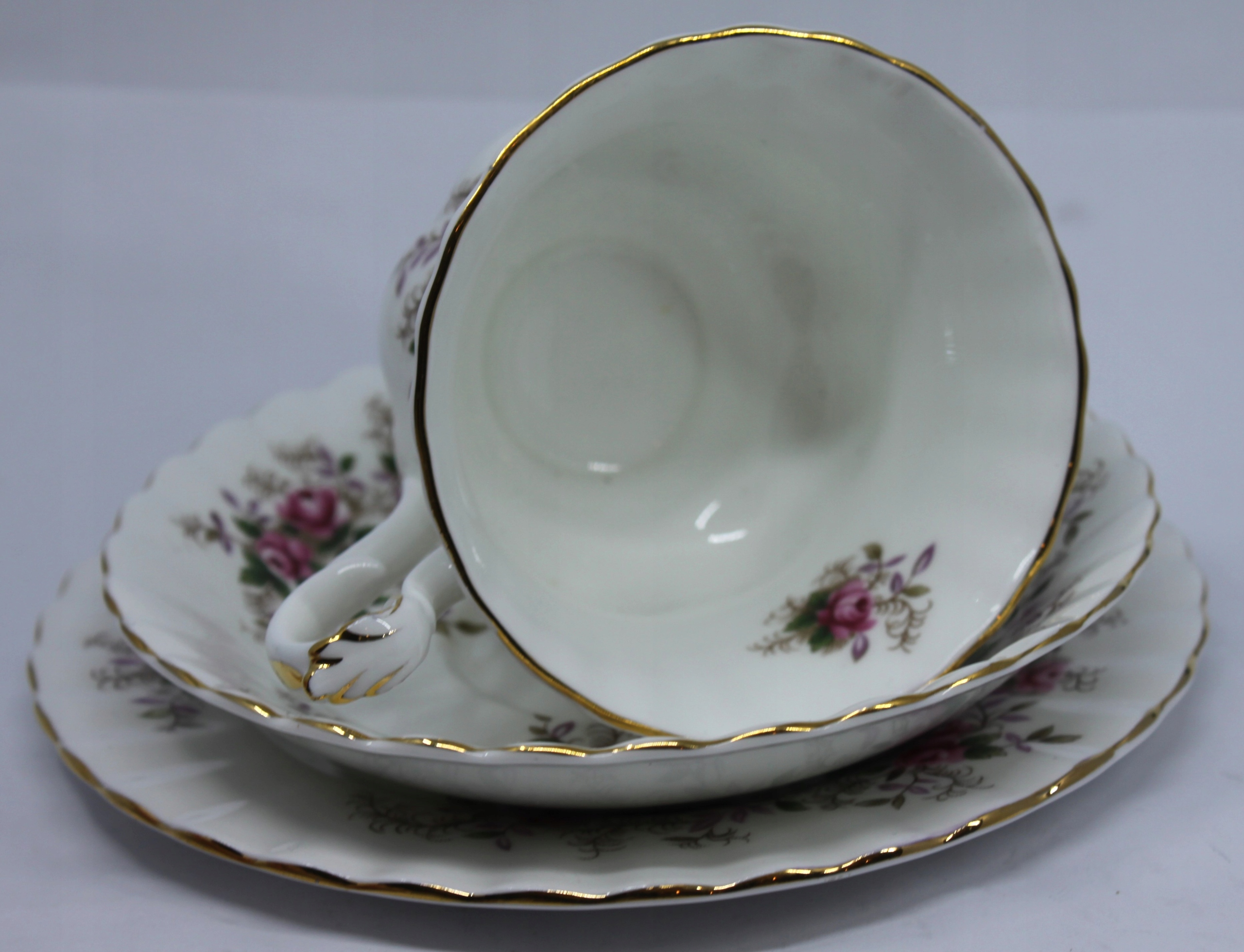 чашка з блюдцею та тарілкою, виготовленою з королівського фарфору з кісткою, закінченою 22 каратним золотом, візерунок лавандової троянди