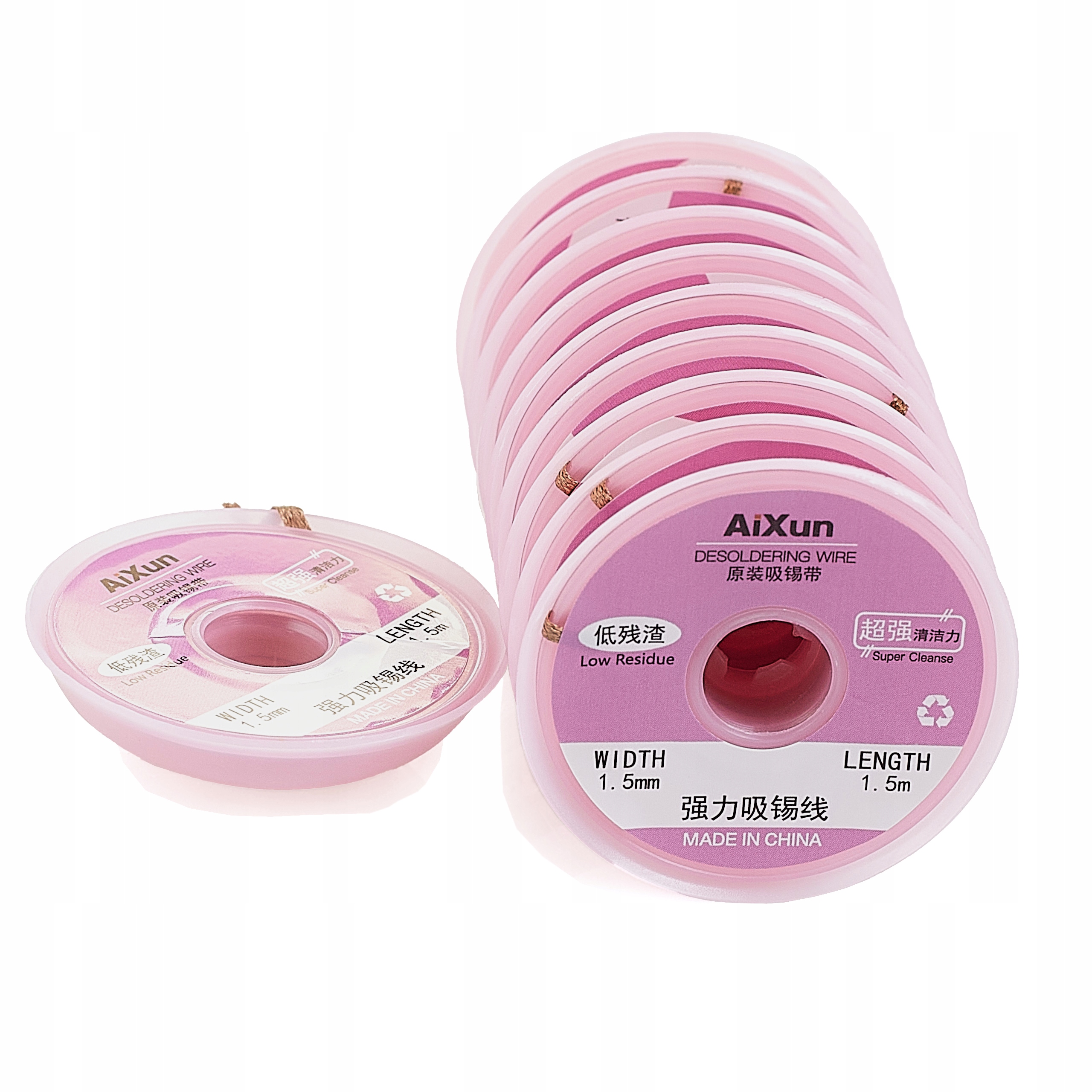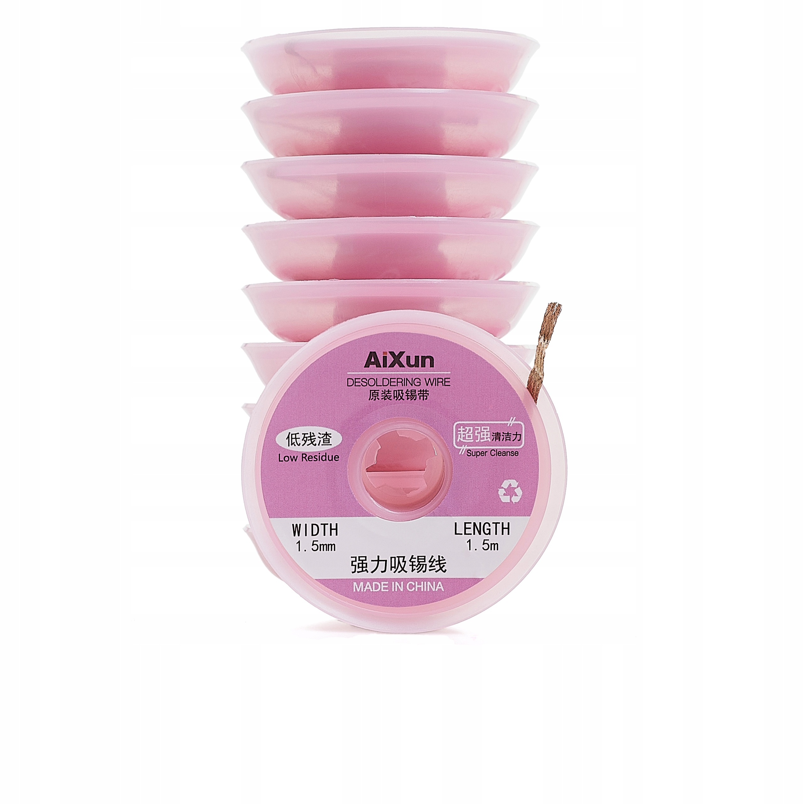 мідна мідна, заплетена 1,5 мм завдовжки і довжиною 1,5 метра, поранений на пластикову котушку, ідеально підходить для всмоктування олова з паяльних полів на плитці друкованої плати. Ця стрічка, також відома як обличчя або всмоктувальна стрічка, складається з тонких мідних кабелів і використовується для очищення колодки, особливо під час повторного переробки систем BGA.