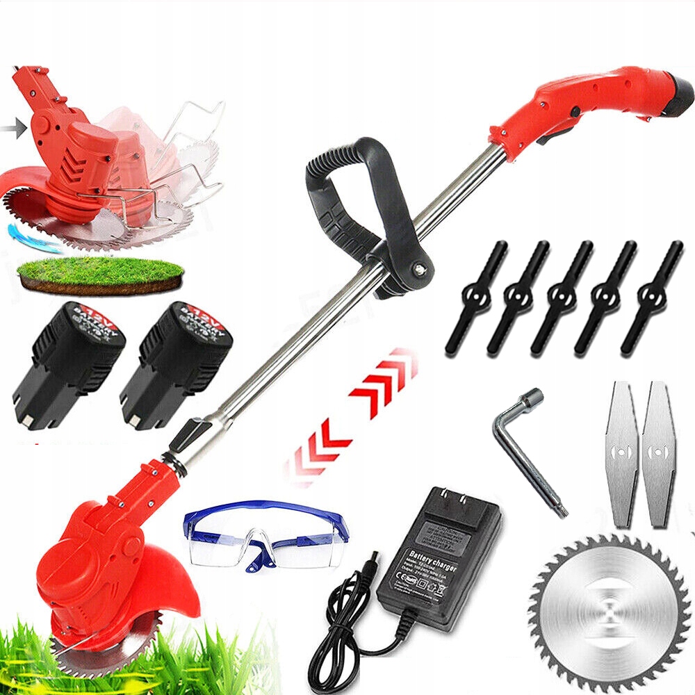 - Повний комплект включає 1 електричну газонокосарку, 2 акумулятори, 1 зарядний пристрій, 5 пластикових ножів, 2 металеві леза, 1 кругле лезо та 1 посібник користувача.