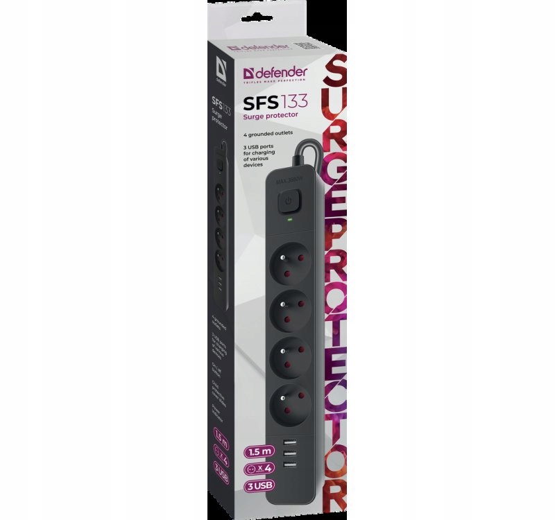 Подовжувач живлення Defender із захистом від перенапруги, чотирма стандартними заземленими розетками, 1,5-метровим кабелем і зручним вимикачем. Крім того, три USB-порти дозволять вам підключати пристрої для заряджання.