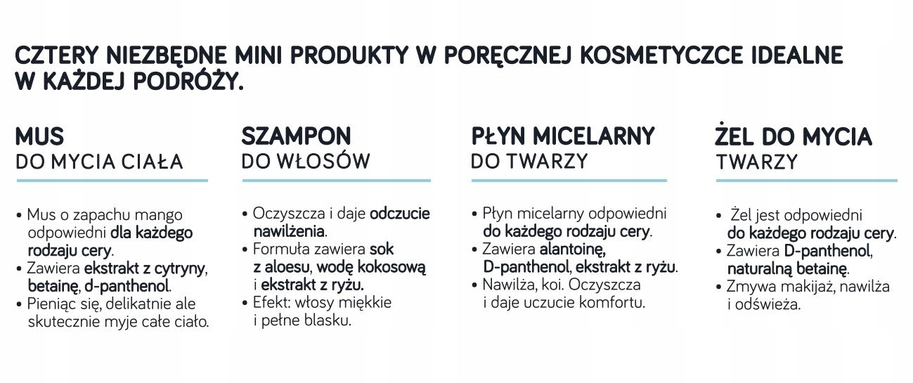 Їдете у відпустку? Візьміть із собою цей зручний набір із 4 мініатюр, які дозволять вам правильно очистити обличчя, тіло та волосся.