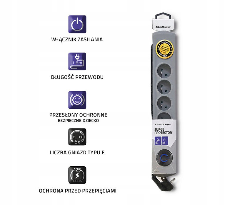 Антиперенапруга Qoltec, 6 розеток із заземленням, 1,8 м ➡️ колір сірий ⬅️