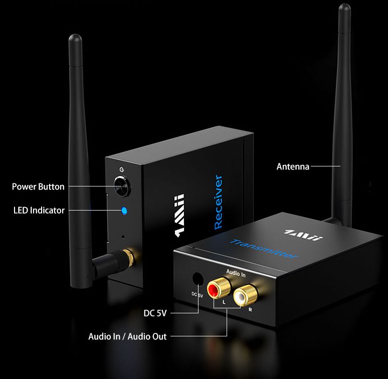 Аудіопередавач можна підключати до будь-якого аудіоджерела, яке має допоміжний вихід 3,5 мм і RCA. Ресівер можна підключити до будь-якої домашньої стереосистеми, динаміків із допоміжним 3,5 мм входом і входом RCA.