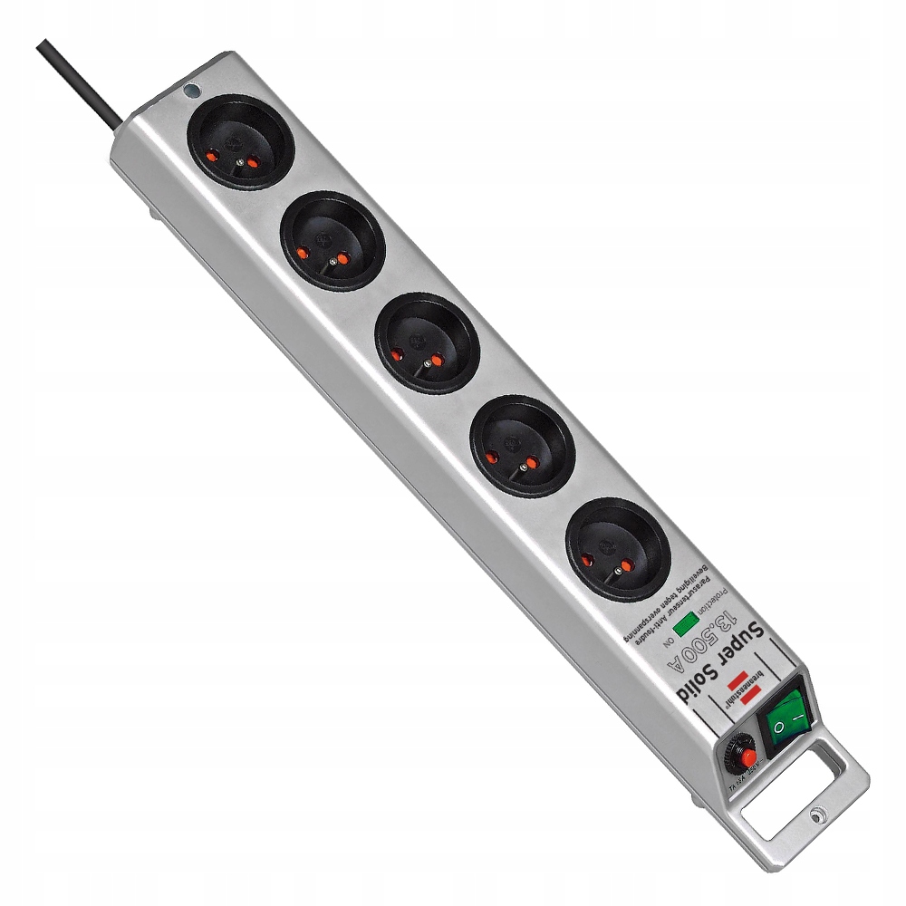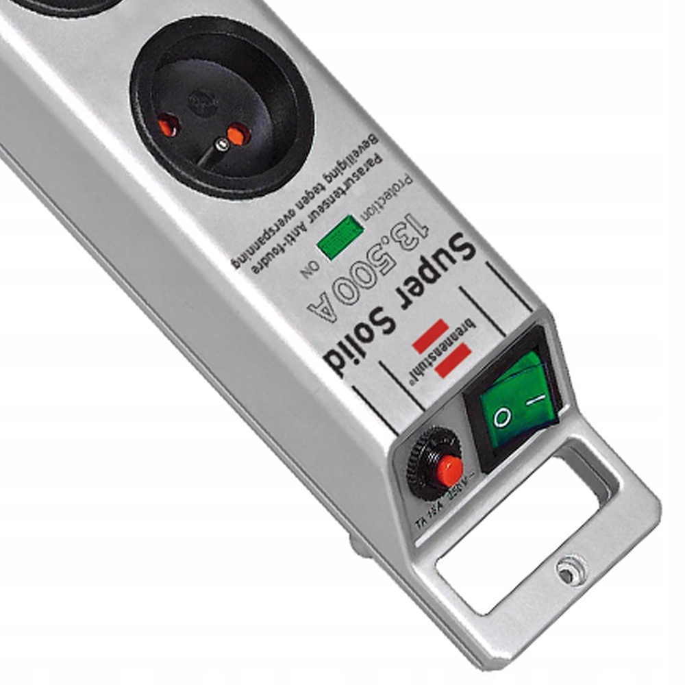 Кабель-подовжувач (анти)напруги Super-Solid від Brennenstuhl. Має 5 розеток з додатковим захистом від дотику, кабель довжиною 2,5 м і вимикач з підсвічуванням двополюсний (вкл/викл) ).