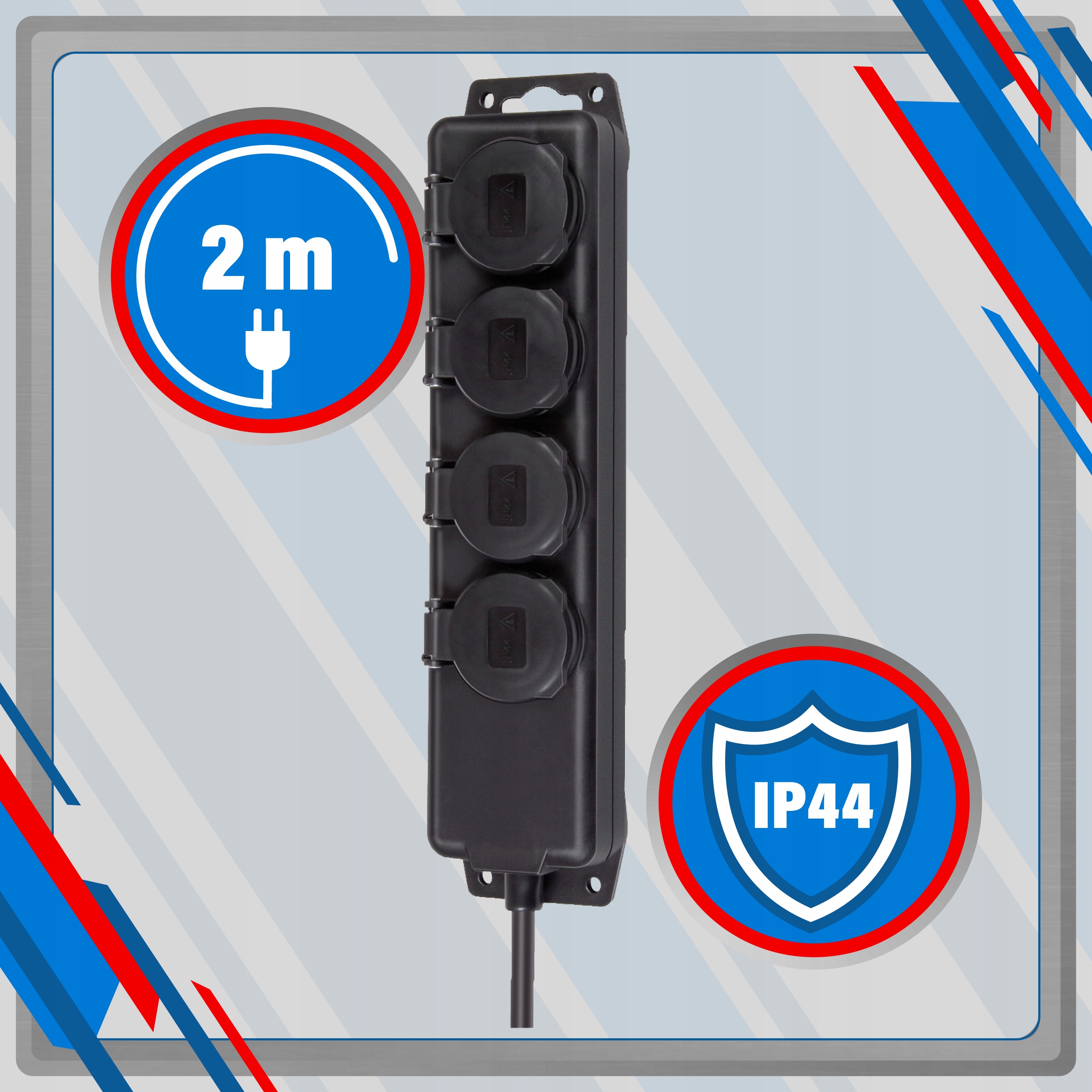 Подовжувач Brennenstuhl відрізняється високим ступенем захисту (IP44). Його захищено від сторонніх тіл і бризків води. Дві його розетки також маютьсамозакриваючі кришки, що робить стрічку придатною для важких умов.