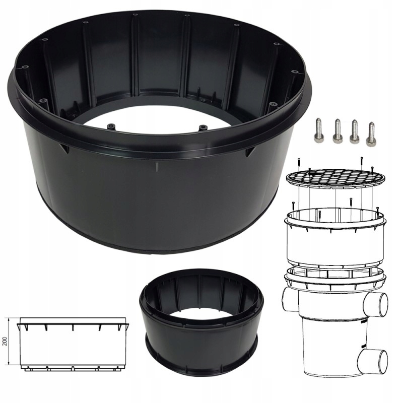 Набір включає кріпильні гвинти INOX і спеціальну прокладку для простого встановлення. Активна висота подовжувача Aquabin становить 200 мм.