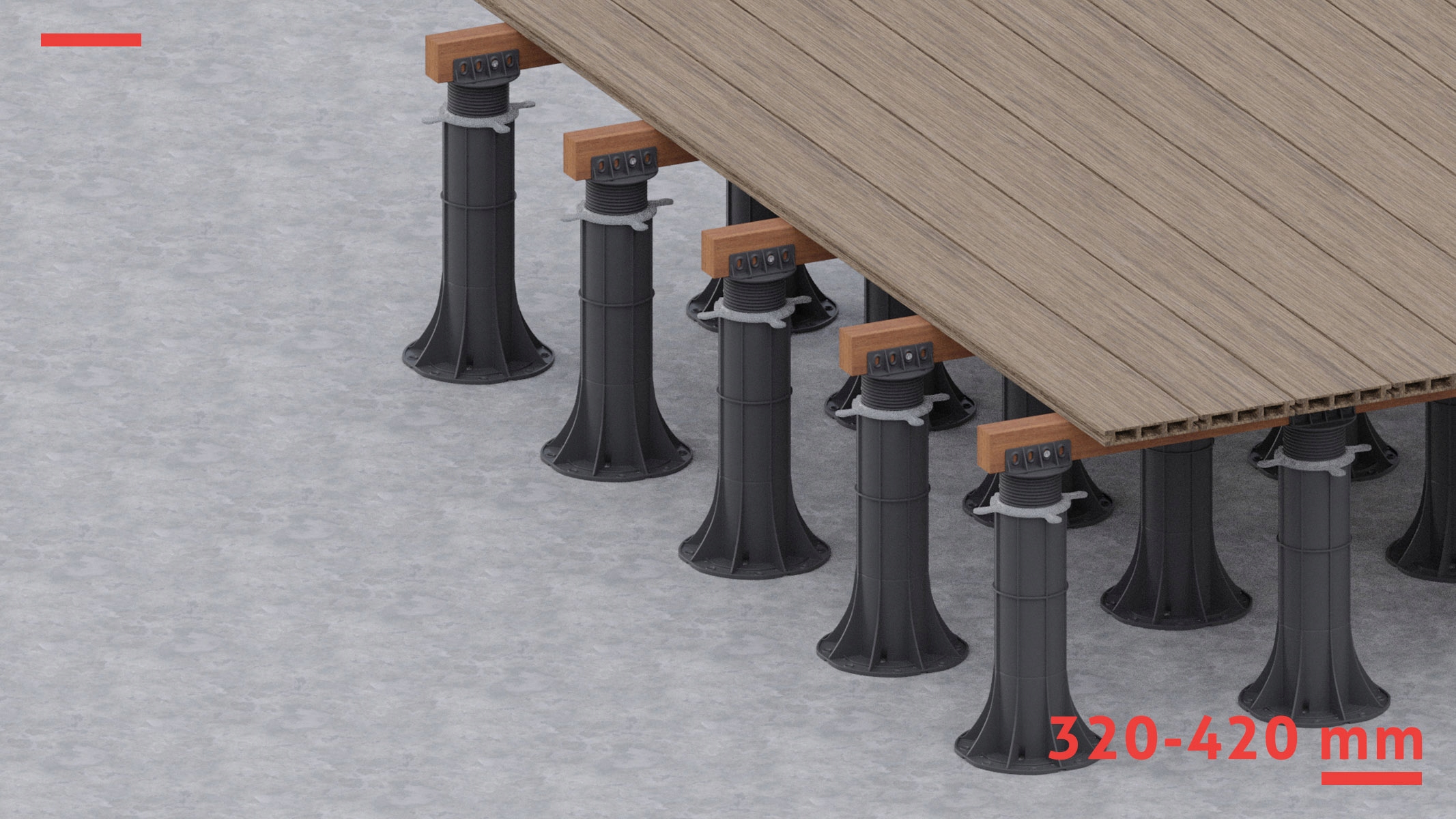 Кожен кронштейн може бути оснащений самовирівнювальною коригуючою головкою, яка регулюватиме кут нахилу елементів тераси в діапазоні 0-7%.