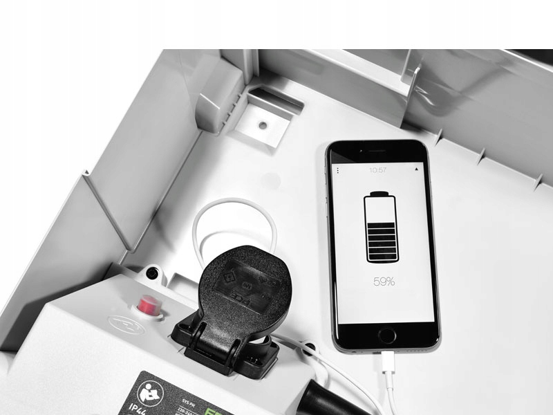 - Постачає до чотирьох електроінструментів одночасно. При необхідності також дозволяє додатково заряджати мобільний телефон або планшет всередині.