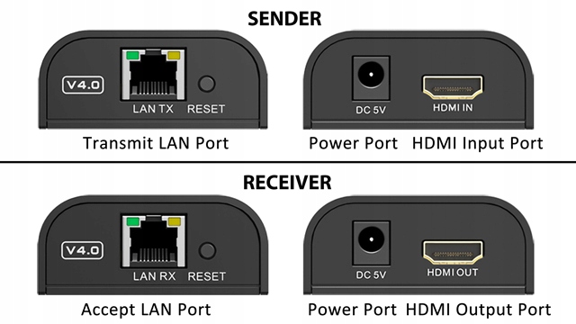 Пропонований розширювач складається з двох елементів: локальної частини (Extender TX) і віддаленої частини (Extender RX). Локальну частину підключаємо кабелем HDMI до джерела сигналу (Blu-Ray плеєр, комп'ютер, супутниковий тюнер, консоль, HD-камера тощо), а віддалену частину кабелем HDMI до приймача сигналу (телевізора, монітора , проектор тощо). Ми під’єднуємо джерела живлення (входять до комплекту) до обох частин і з’єднуємо обидві частини разом за допомогою кабелю типу вита пара категорії 5e (або вище), закінченого з обох боків штекерами RJ45 у стандарті 568B (тобто типові патч-корди) довжиною до до 120 м (для витої пари категорії 6)